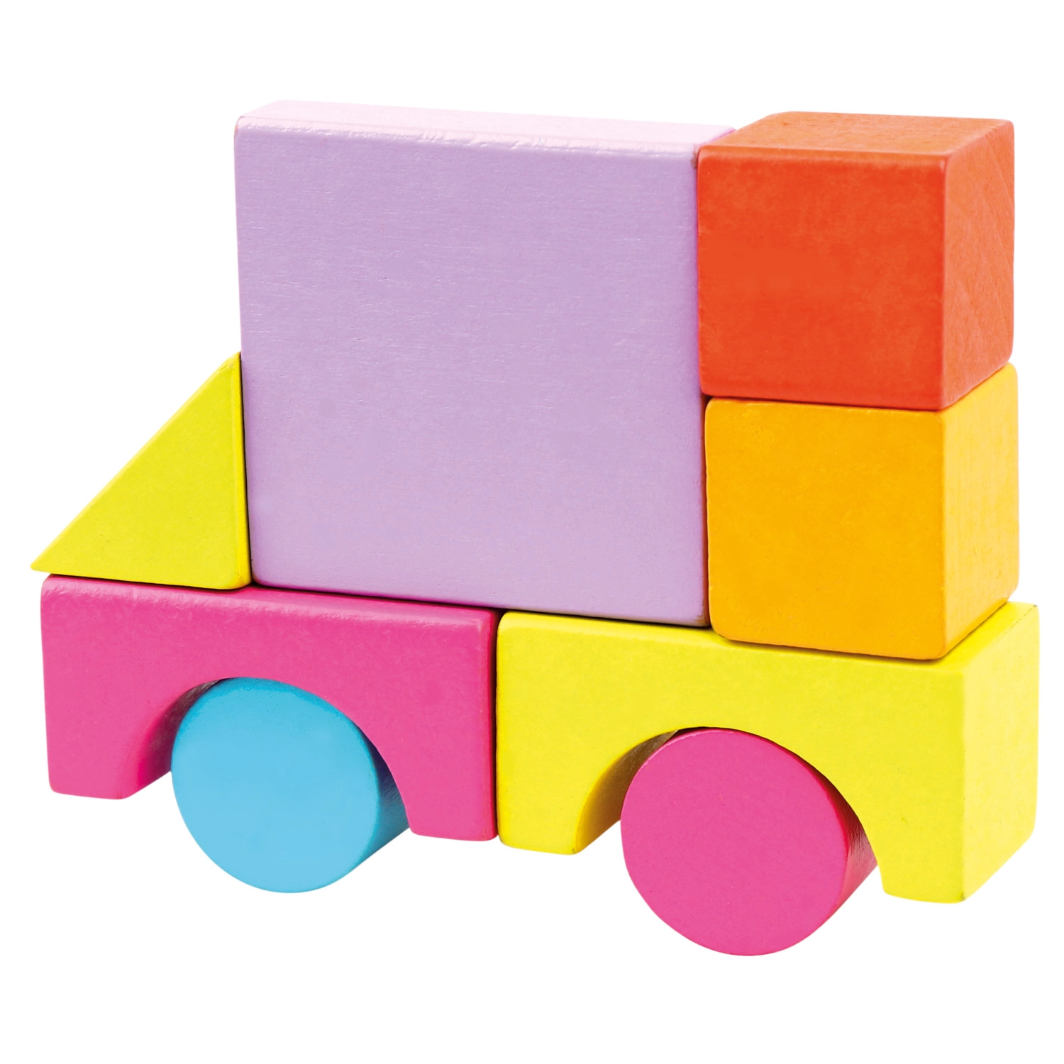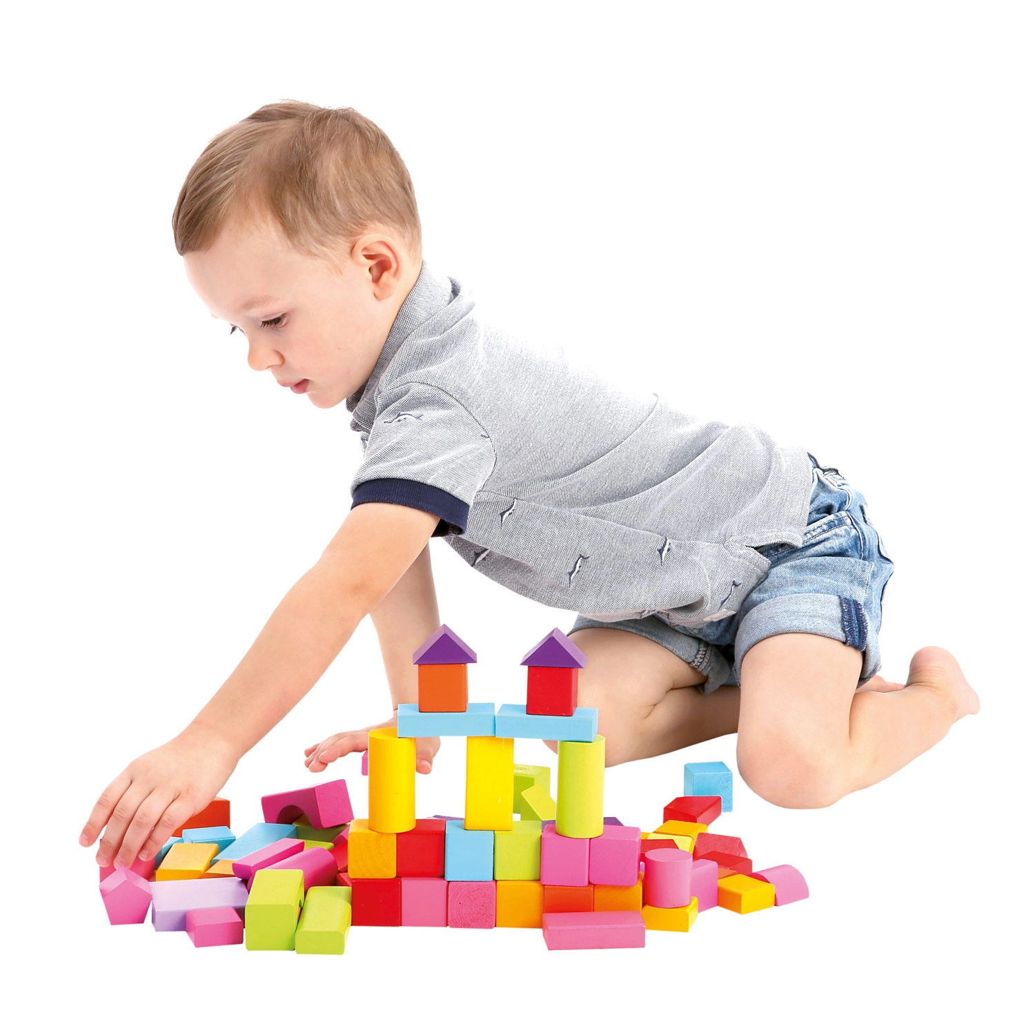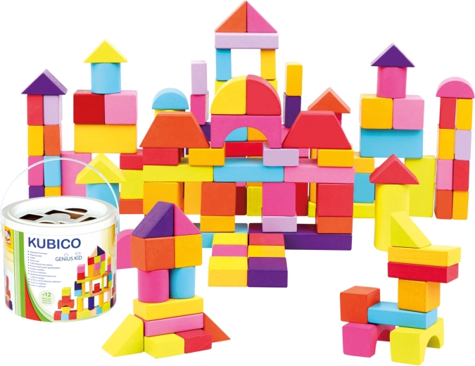 L’ensemble comprend des blocs de différentes formes — cubes, pavés, cylindres, arches et triangles — aux couleurs vives, favorisant un jeu créatif et ouvert.