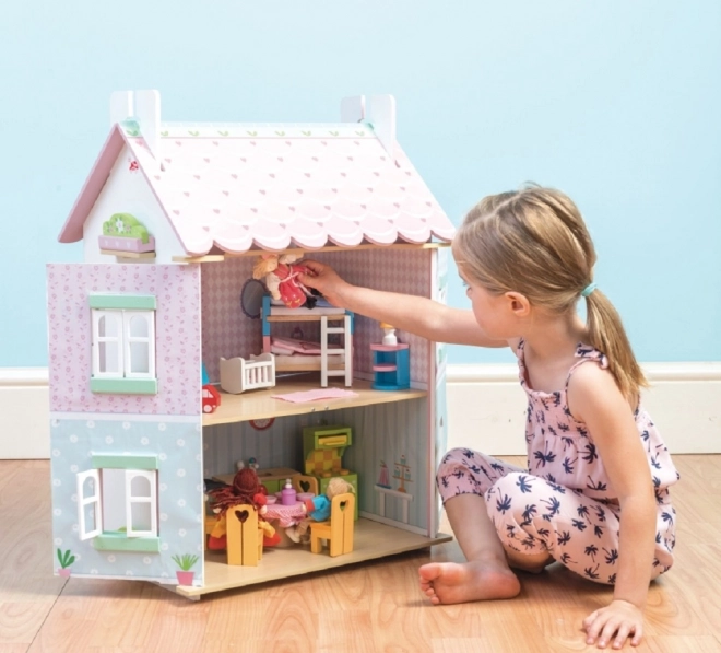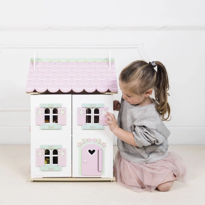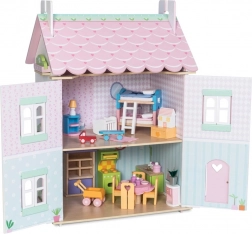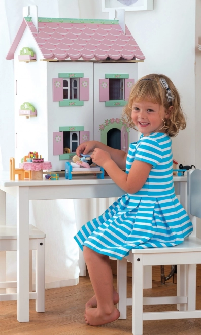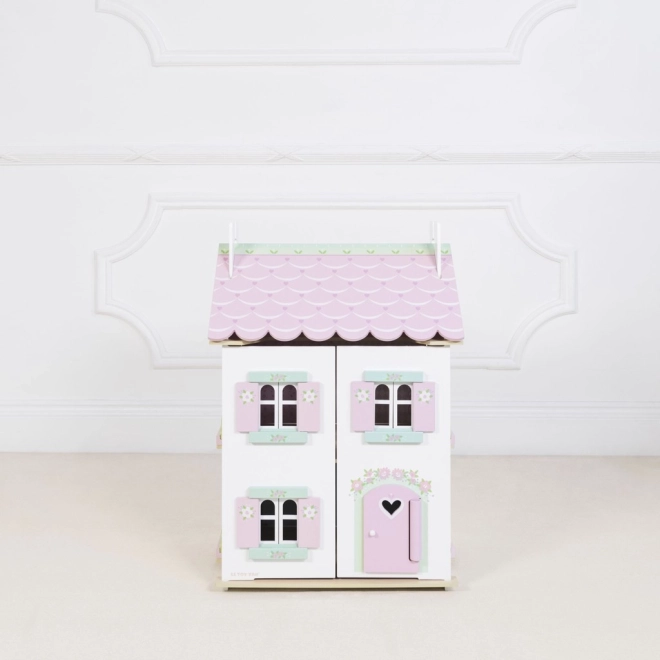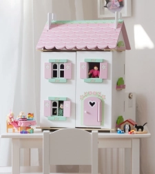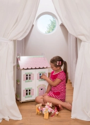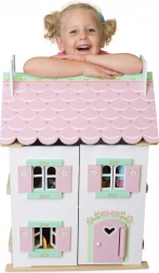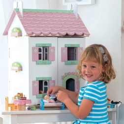 La maison de poupées Sweetheart Cottage séduit par ses détails – motifs de cœurs et de fleurs, tons pastels et agencement réfléchi des pièces. La façade s’ouvre entièrement pour un accès aisé à toutes les pièces, et en soulevant une partie du toit, on découvre un grenier douillet.