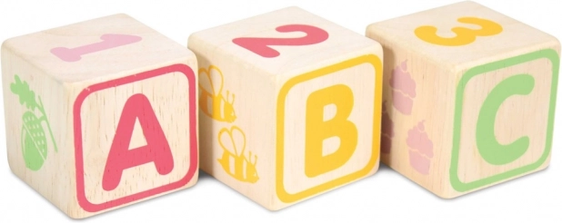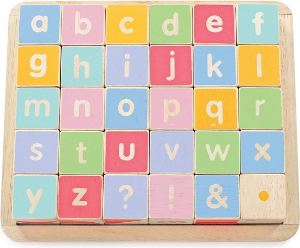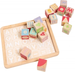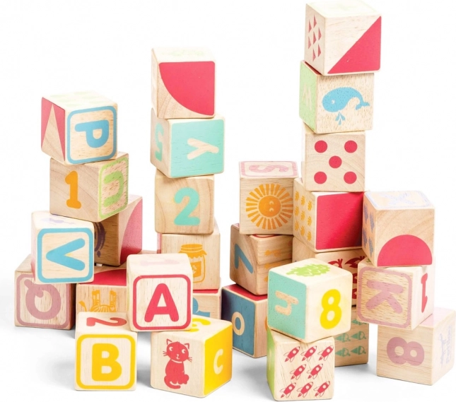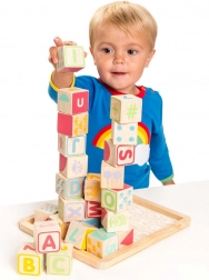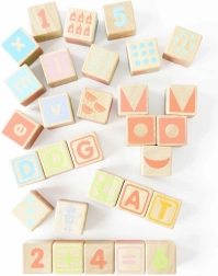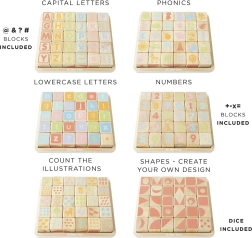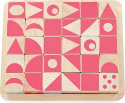 Les bords arrondis des cubes et de la base de rangement assurent une manipulation confortable et sécurisée. Le jouet est sans plastique, fabriqué en bois certifié FSC avec un accent sur la production éthique et la durabilité. Le set soutient le développement des compétences cognitives, de la représentation spatiale et des capacités linguistiques.