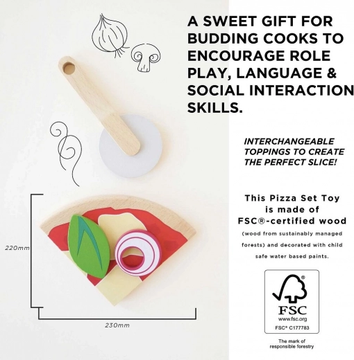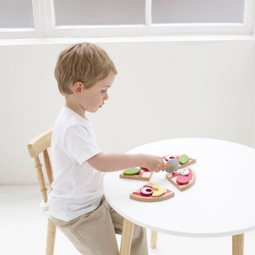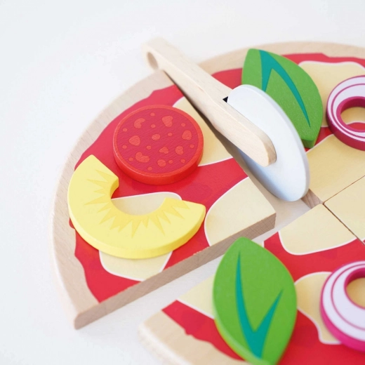 Les ingrédients amovibles et le coupe-pizza en bois fonctionnel stimulent l’imagination et la motricité fine. Les enfants peuvent “cuire”, décorer et couper selon leurs envies.