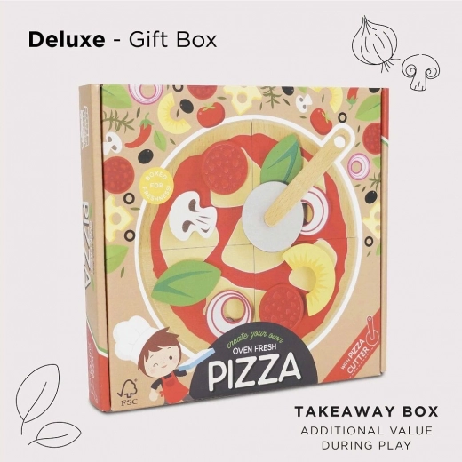 4 parts de pizza, ingrédients amovibles, coupe-pizza en bois, boîte à pizza