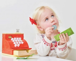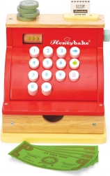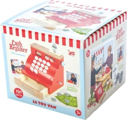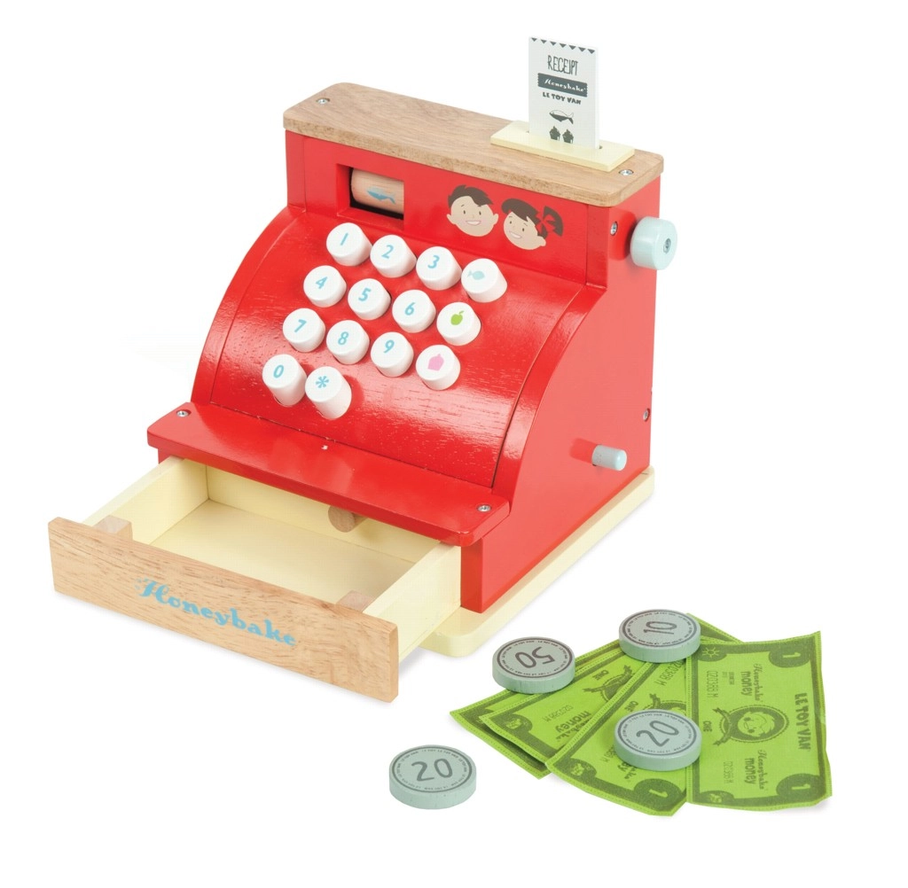 La caisse enregistreuse en bois rouge LE TOY VAN de la collection primée Honeybake allie une fabrication de qualité, des matériaux sûrs et un charme vintage rehaussé de détails dorés. Idéale pour jouer au magasin et développer les compétences sociales, la créativité et les bases des mathématiques.
