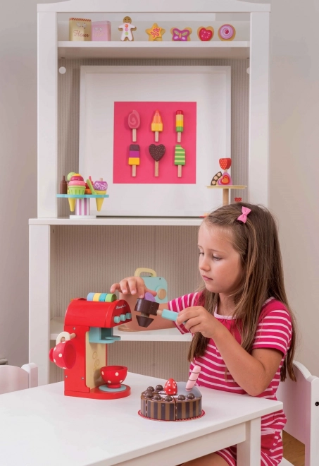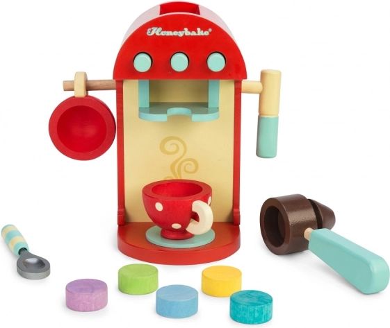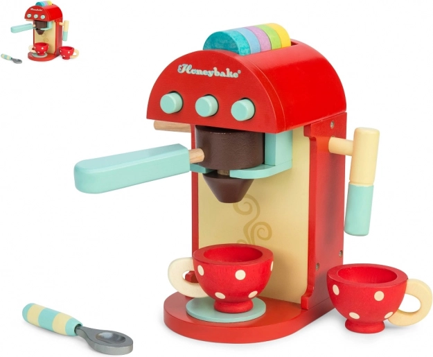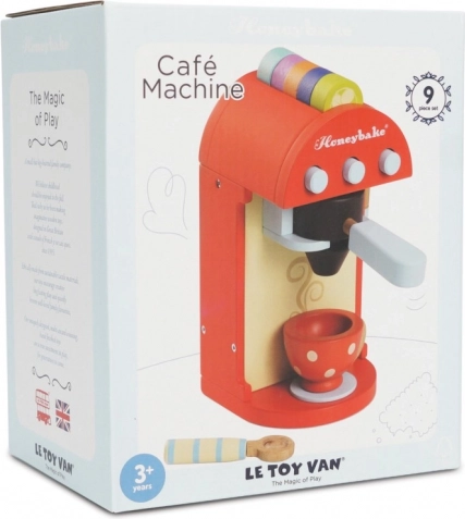 Cette machine à café en bois de qualité offre aux enfants une expérience authentique de préparation du café. Les capsules colorées peuvent être insérées dans la manette pour « préparer » la boisson directement dans la tasse peinte ; le mousseur à lait et la cuillère sont également inclus. Les capsules se rangent facilement dans l’ouverture sur le dessus de la machine, tout reste ainsi à portée de main.