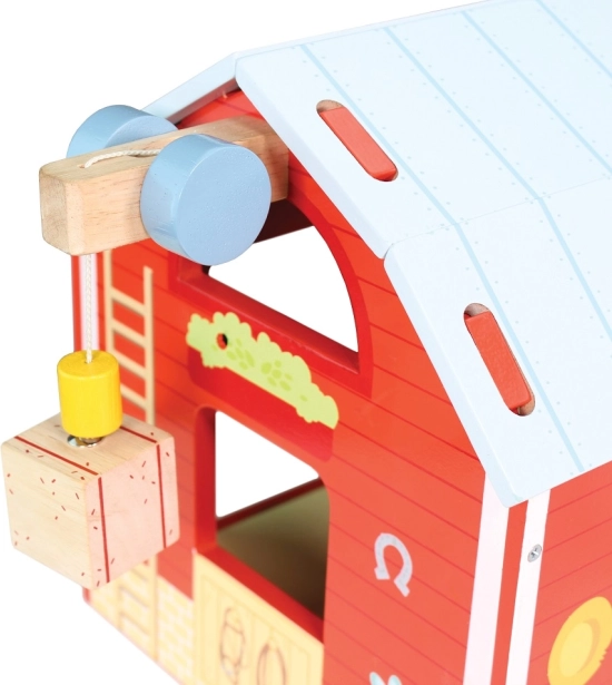 Grange rouge en bois LE TOY VAN avec treuil magnétique. Matériaux durables, peintures sûres, portes ouvrantes. Jouet idéal pour enfants 3+.