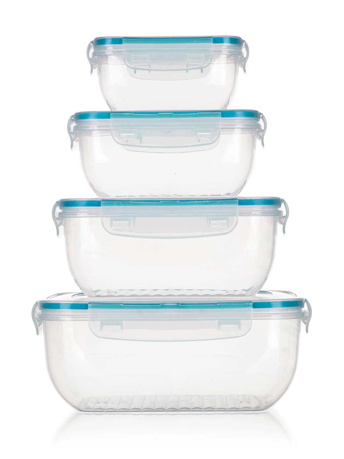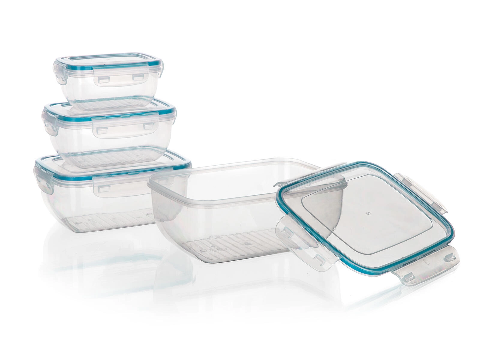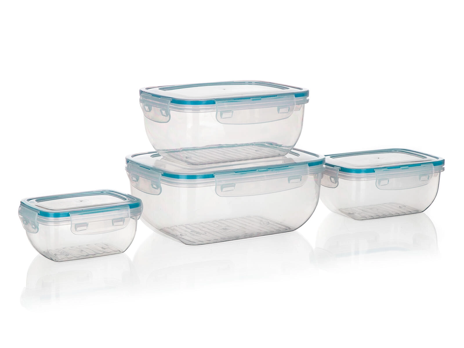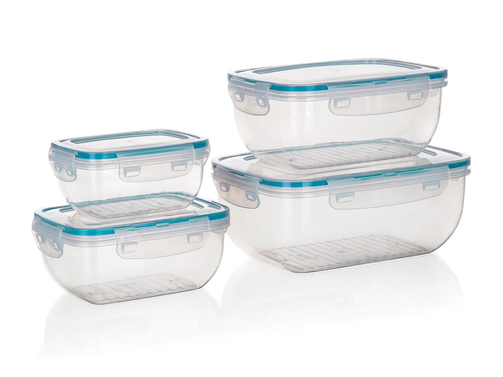 Pratique lot de quatre boîtes rectangulaires LEYA avec fermeture hermétique et étanche pour garder vos aliments plus longtemps frais. Corps transparent pour un contrôle facile du contenu et joint en silicone turquoise avec quatre clips pour une fermeture sûre. Idéales pour le stockage, le transport et l’organisation de la cuisine, les boîtes sont empilables et encastrables pour gagner de la place.