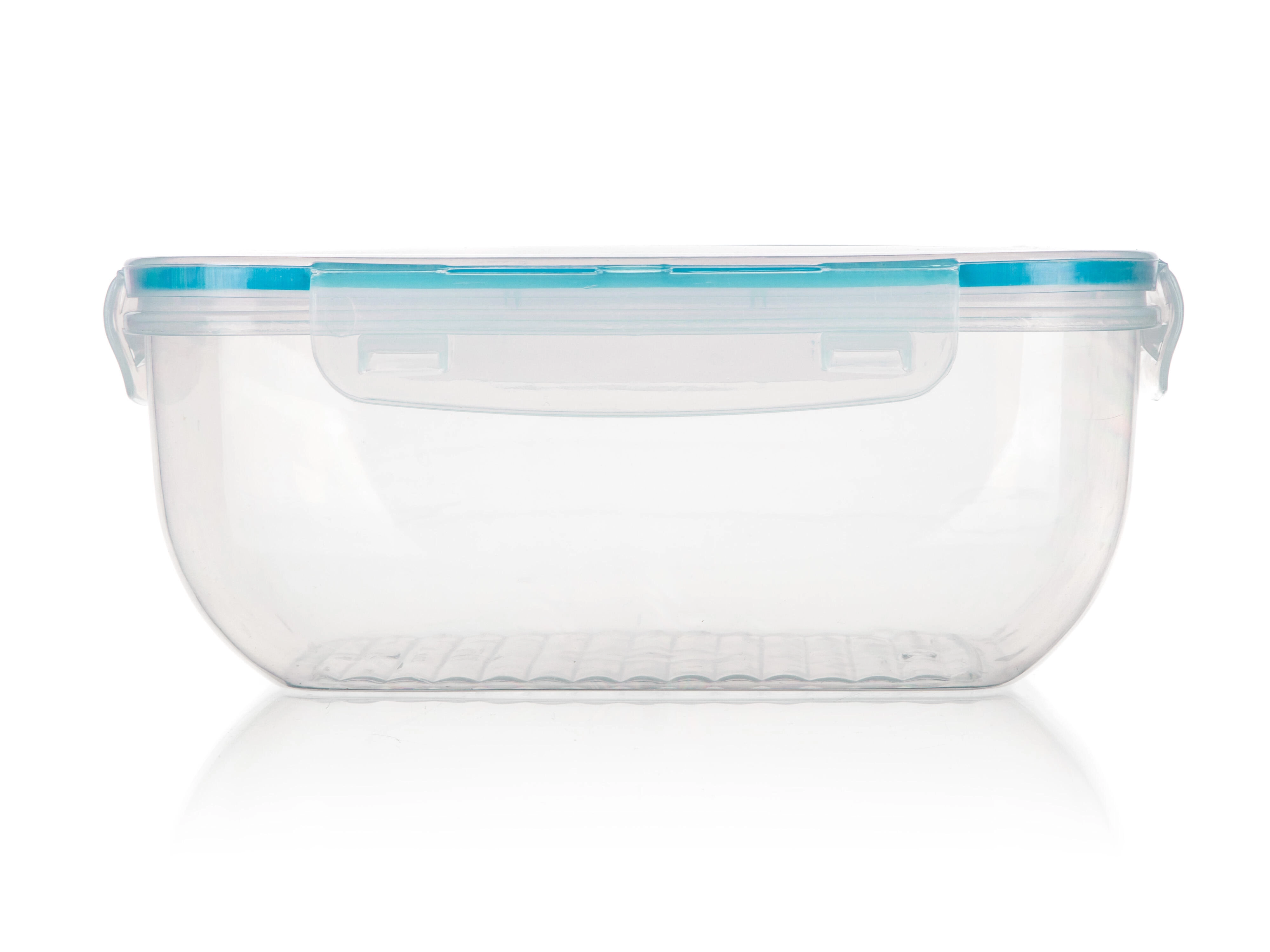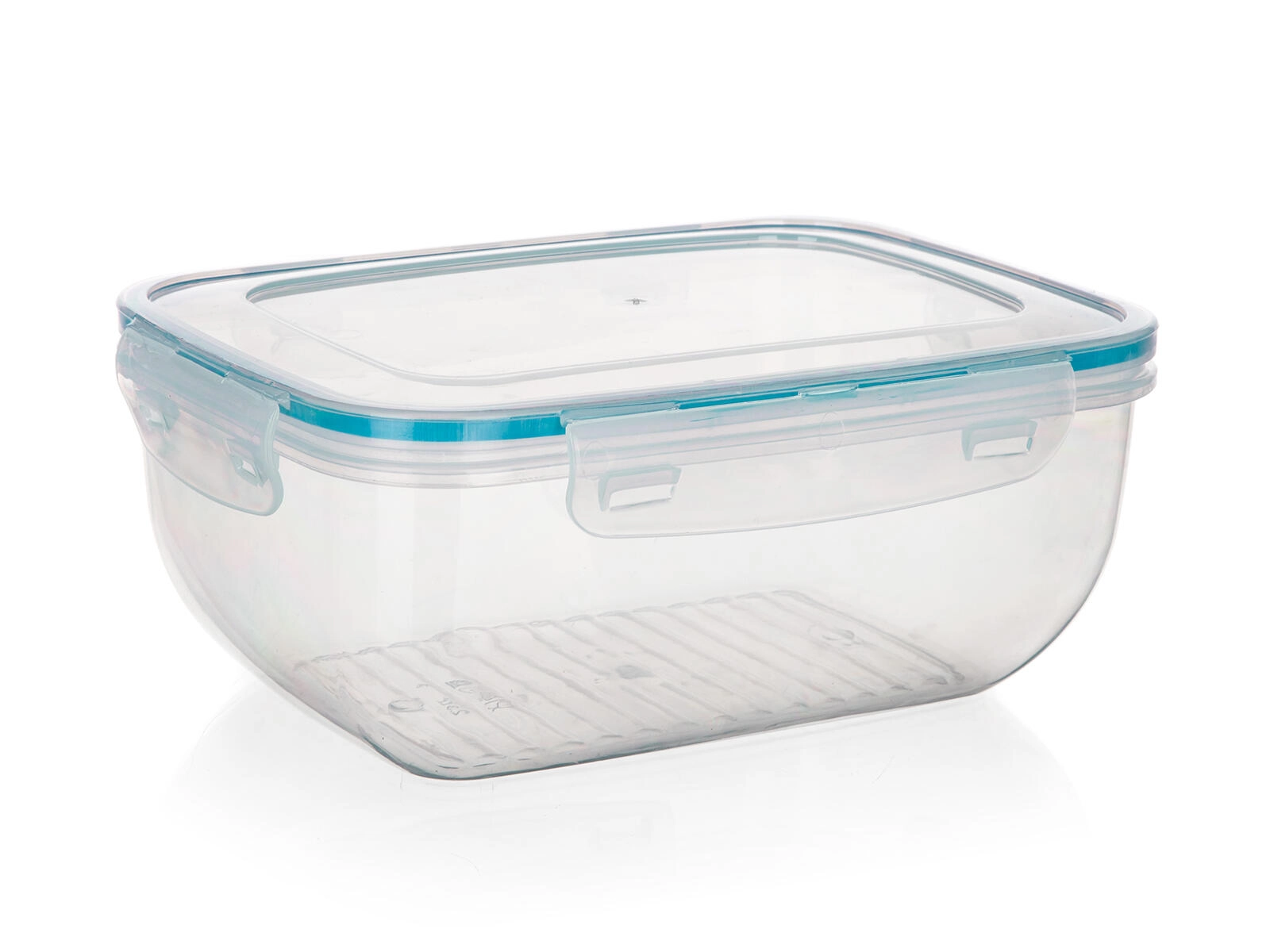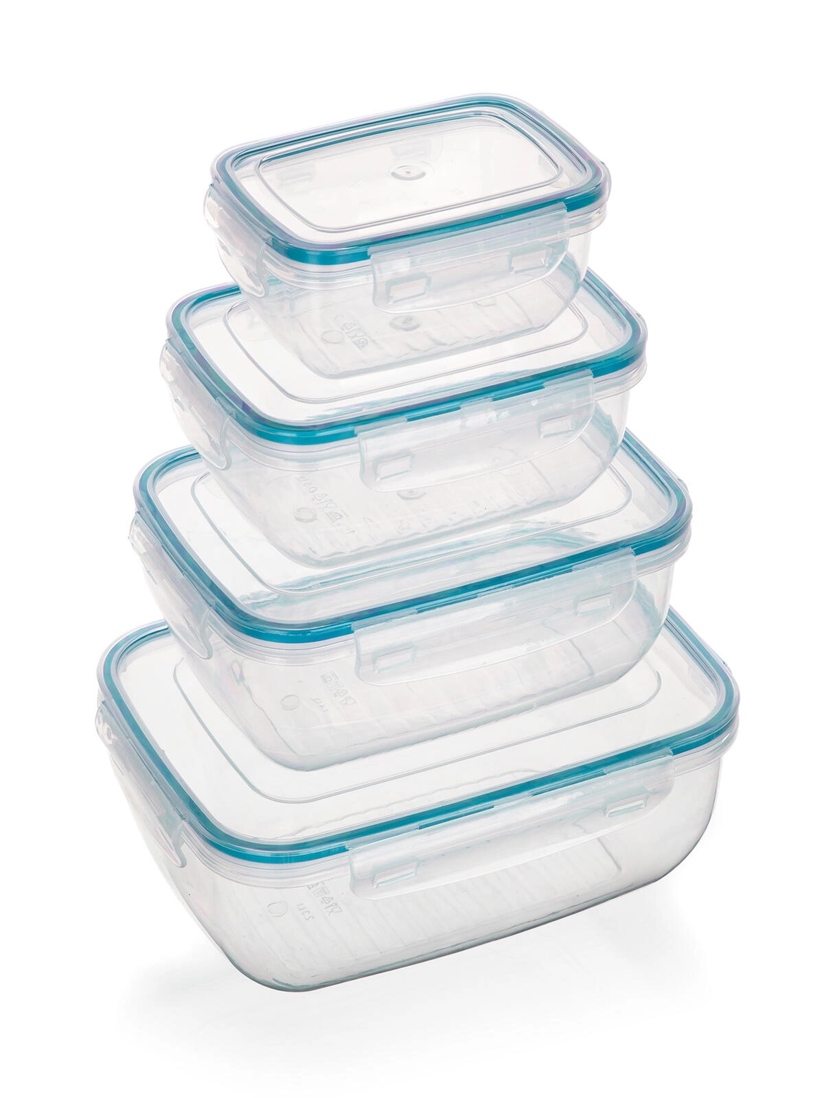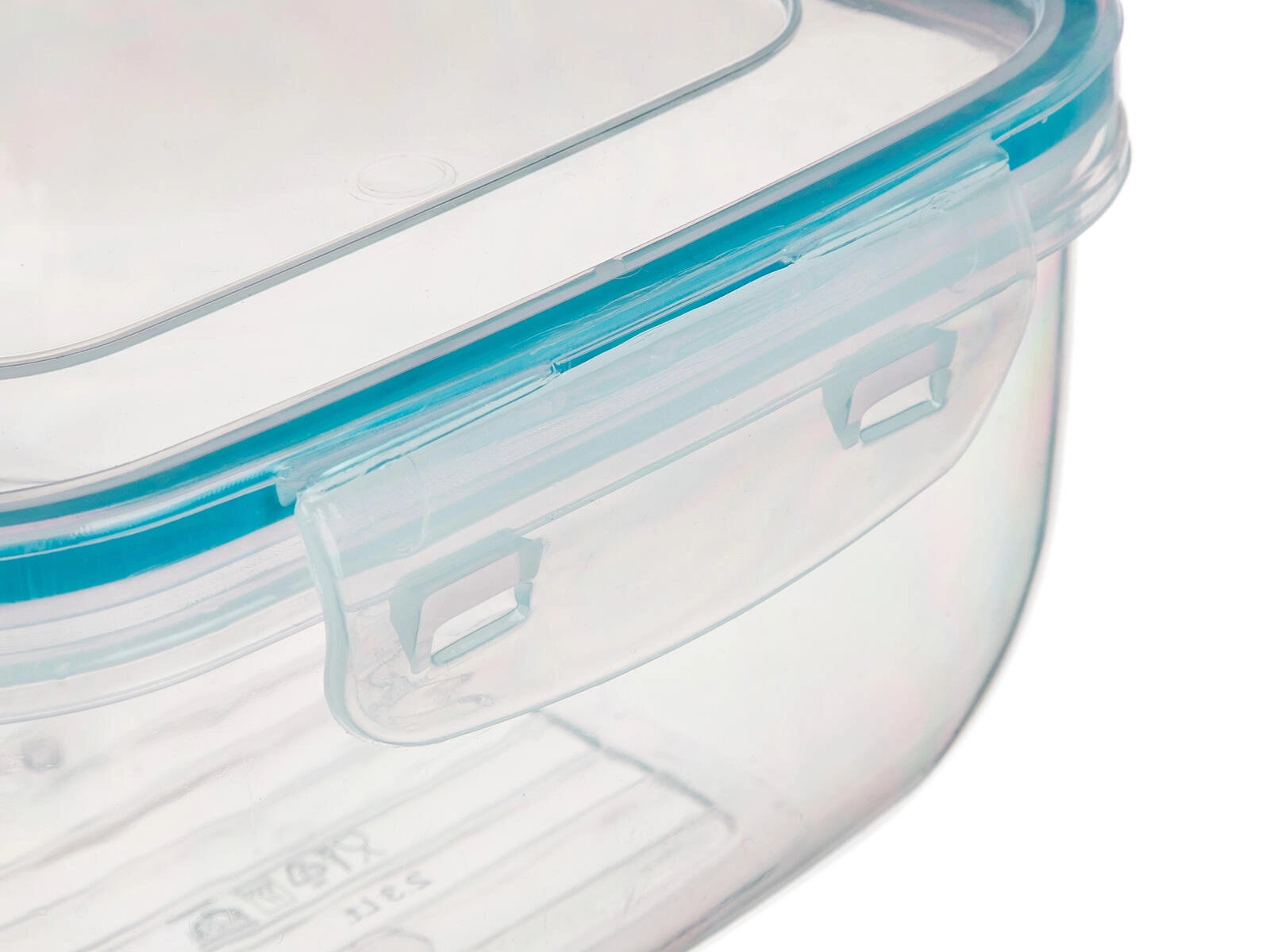 Pratique lot de quatre boîtes rectangulaires LEYA avec fermeture hermétique et étanche pour garder vos aliments plus longtemps frais. Corps transparent pour un contrôle facile du contenu et joint en silicone turquoise avec quatre clips pour une fermeture sûre. Idéales pour le stockage, le transport et l’organisation de la cuisine, les boîtes sont empilables et encastrables pour gagner de la place.