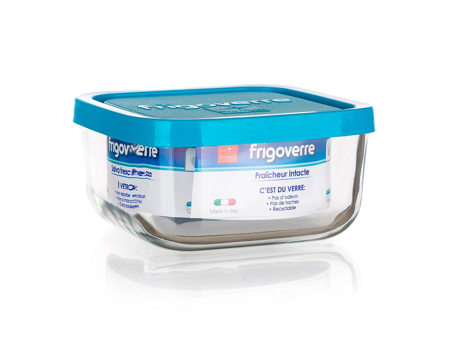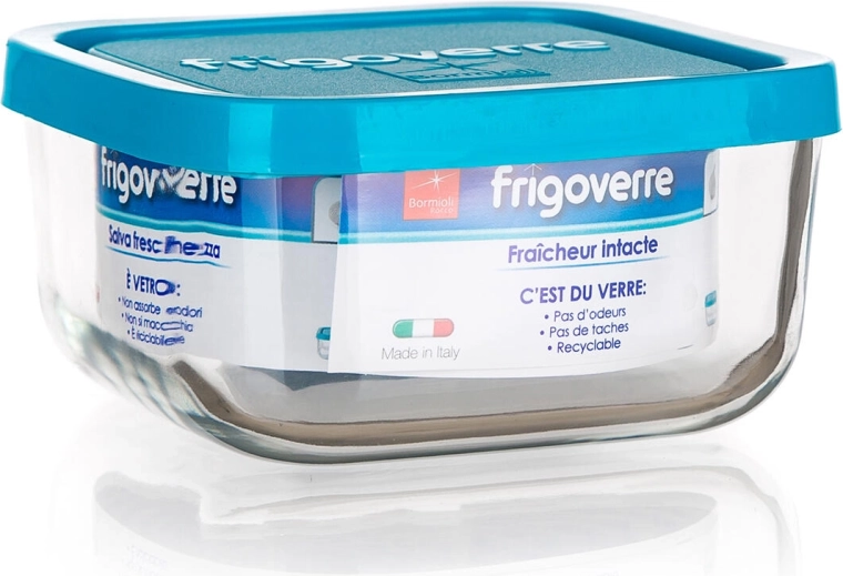 La boîte FRIGOVERRE combine un verre de qualité avec un couvercle robuste en polypropylène de couleur bleue. Sa forme carrée de 19 × 19 × 8 cm permet d’économiser de la place au réfrigérateur comme au garde-manger, et sa capacité de 2 litres est parfaite pour des plats cuisinés, salades, ingrédients ou restes de dîner.