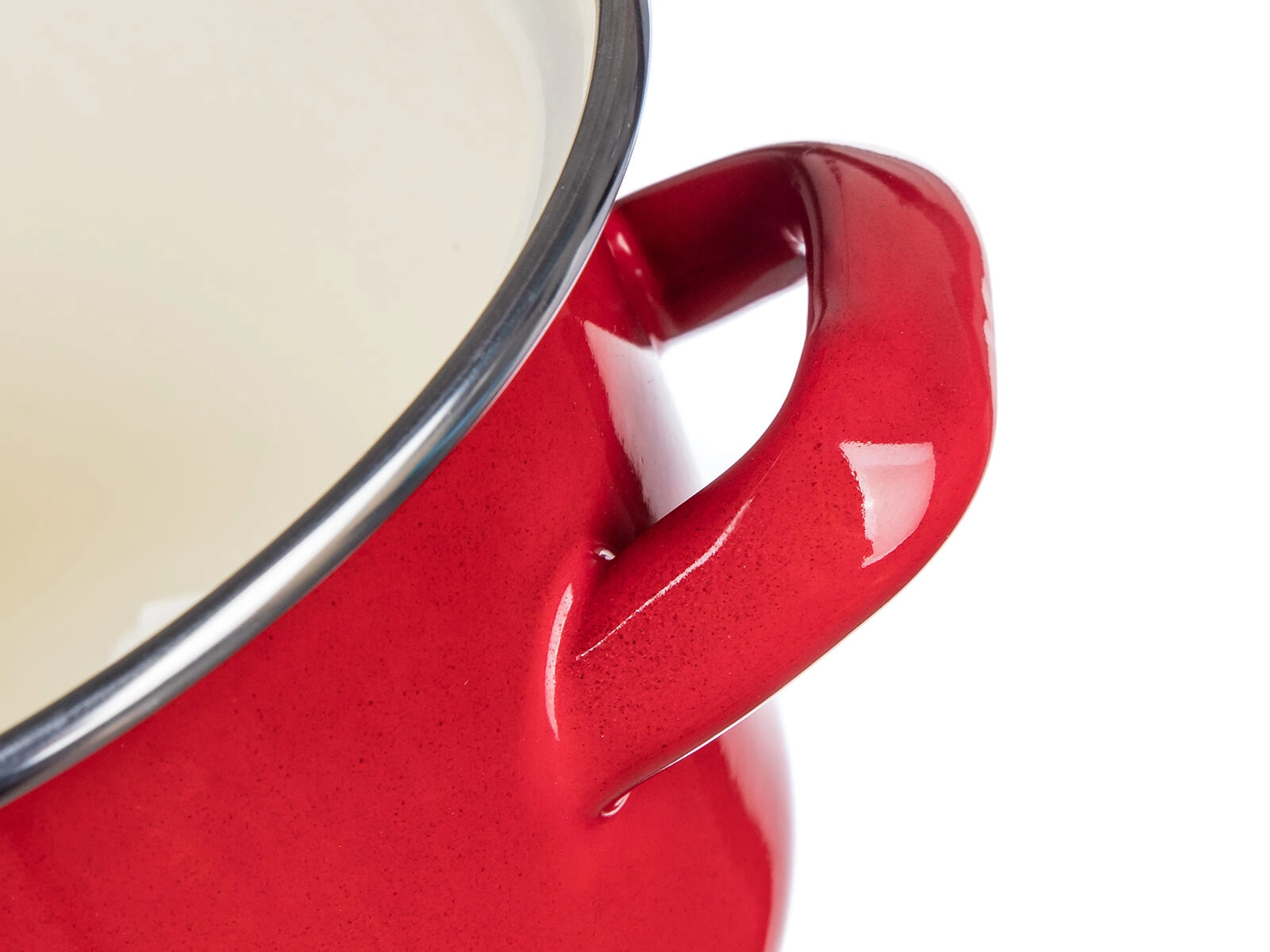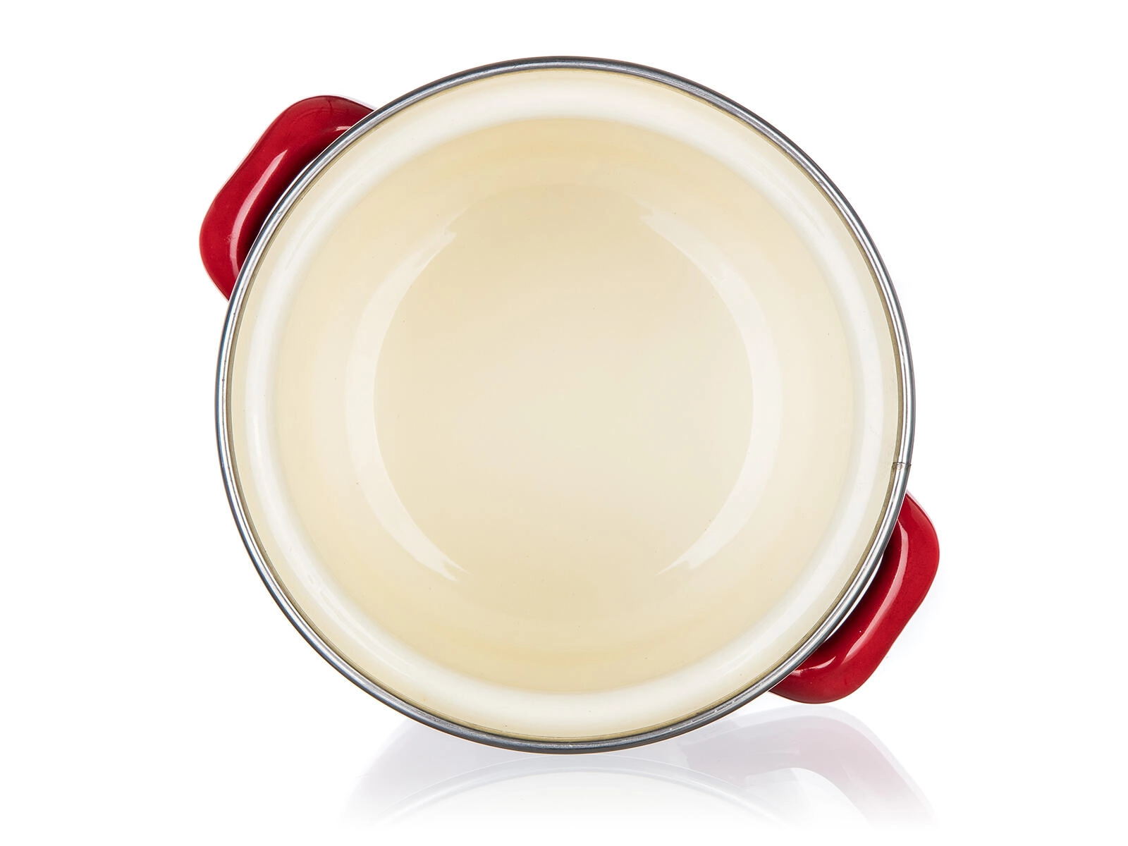 L’extérieur en émail rouge avec fond noir est élégant, tandis que l’intérieur crème clair facilite le contrôle de la cuisson. Le fond convient à l’électricité, au gaz, à la vitrocéramique et à l’induction, vous permettant de l’utiliser dans toute cuisine.