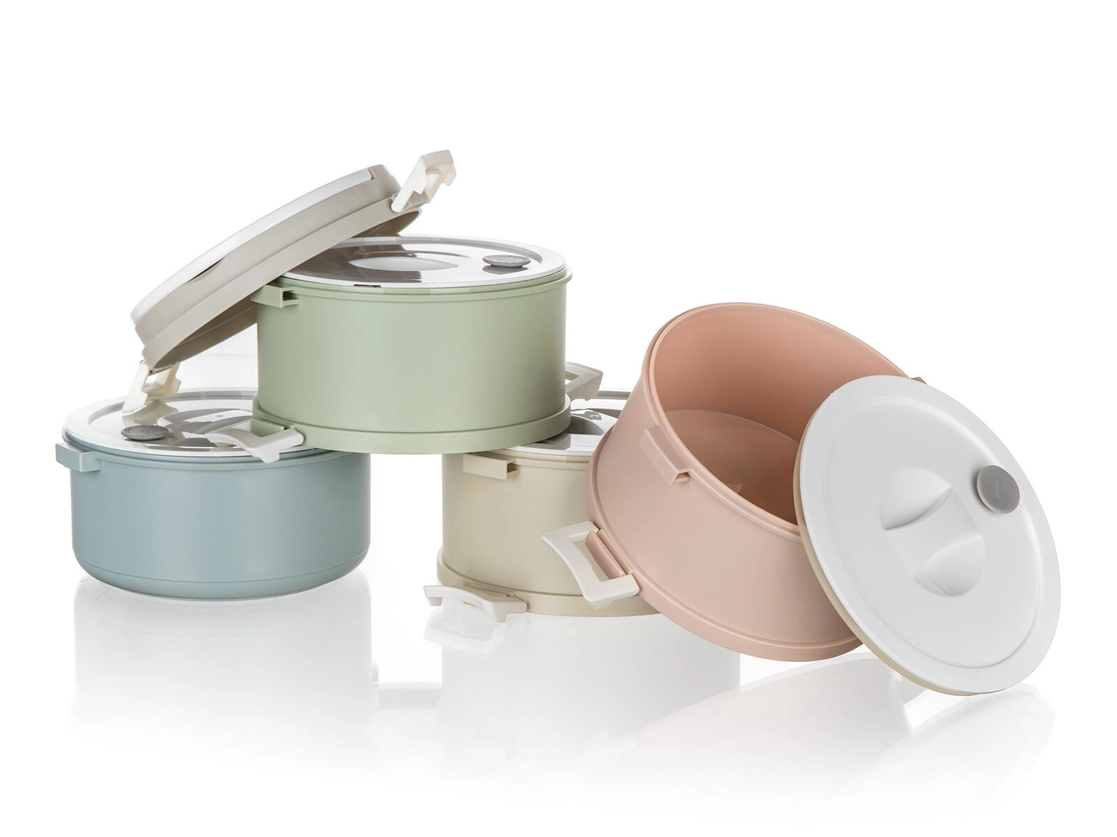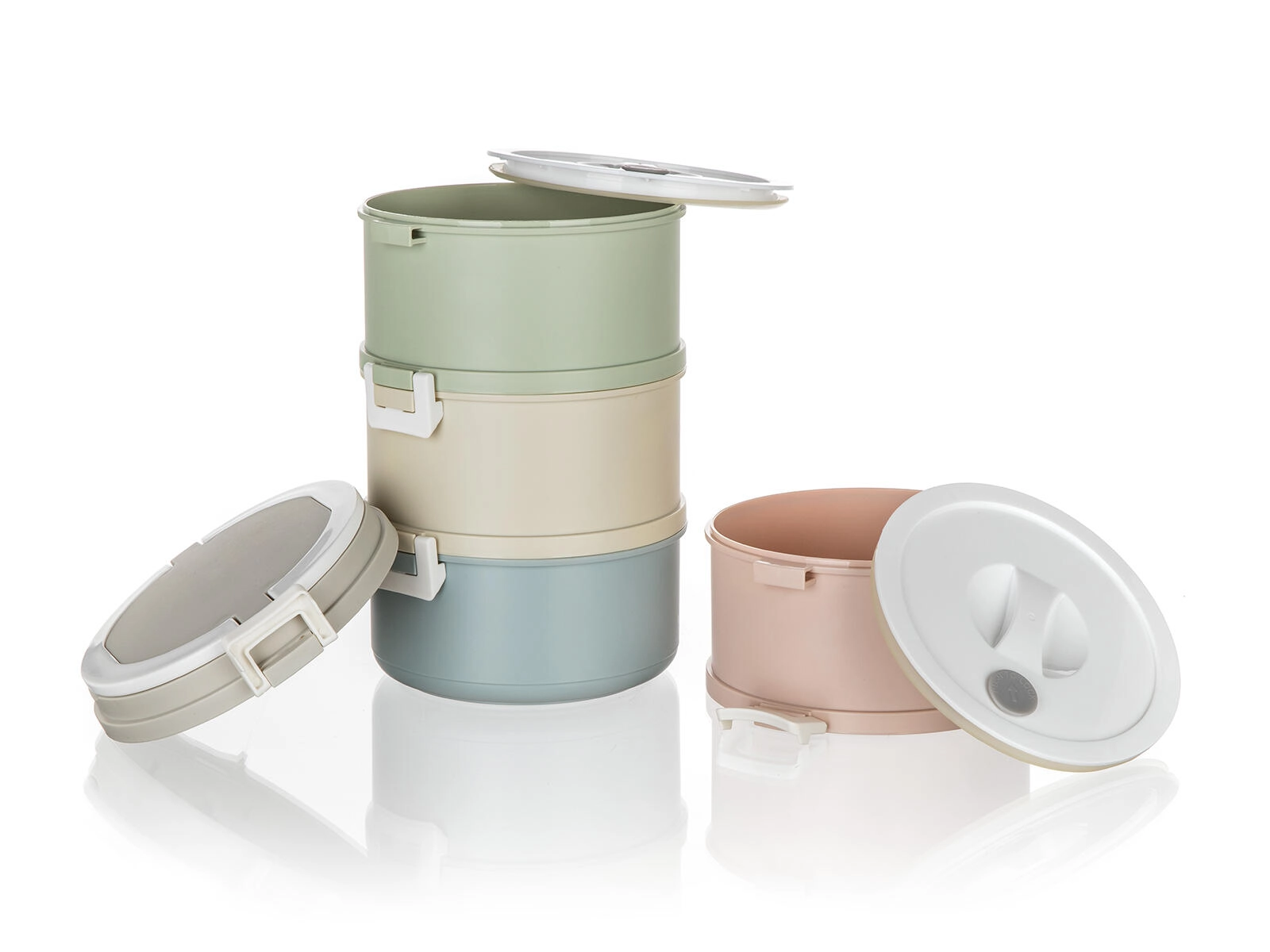 La construction modulaire permet de composer et séparer librement les étages selon les besoins. Le plastique résistant convient à un usage quotidien, les boîtes pouvant être utilisées séparément au réfrigérateur, au congélateur et pour le réchauffage au micro-ondes. L’entretien est facilité par la compatibilité avec le lave-vaisselle.