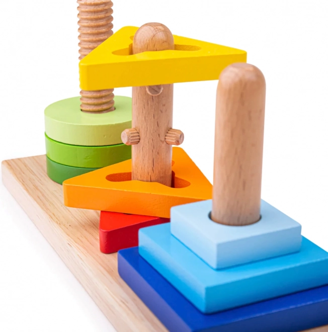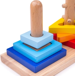 Chaque cheville a une conception différente pour les ronds, triangles et carrés – les enfants doivent placer correctement les pièces et souvent les faire pivoter.
