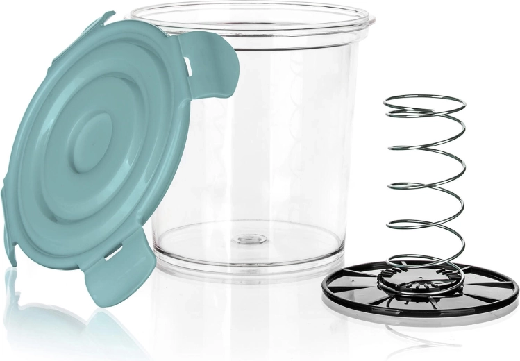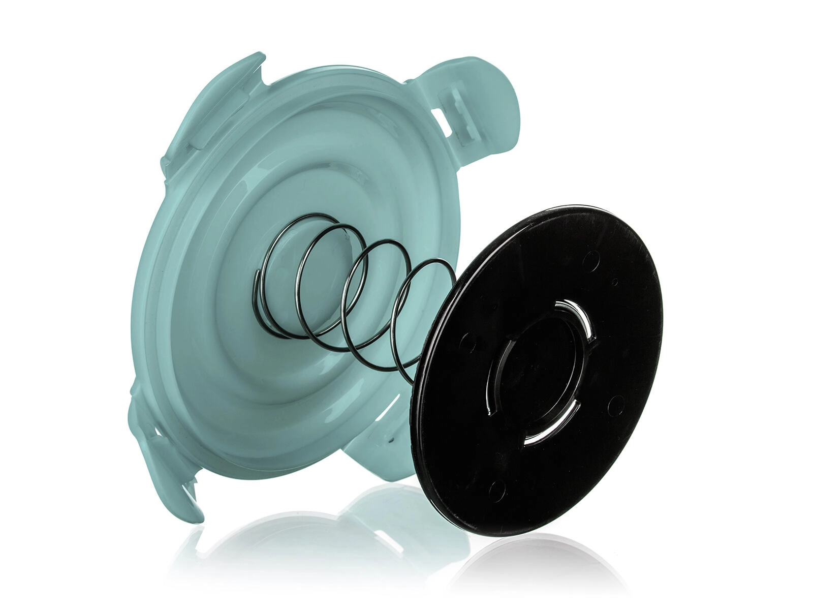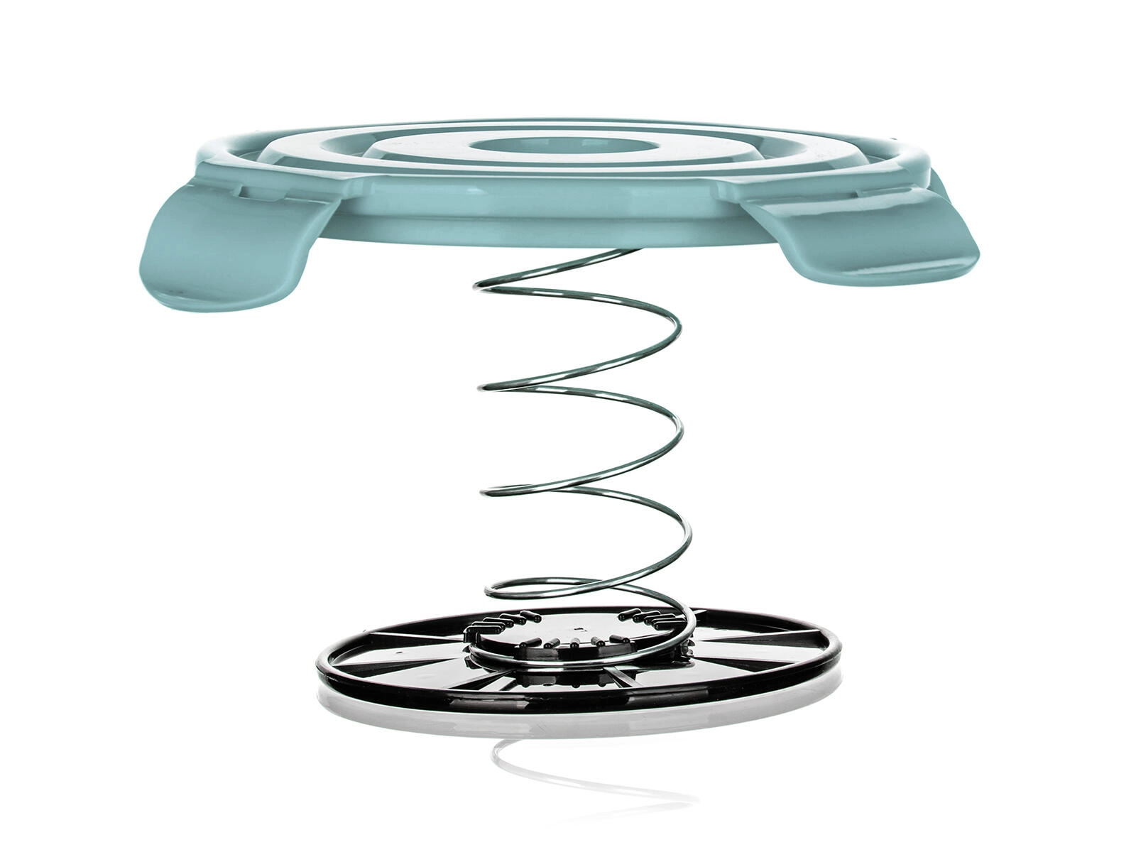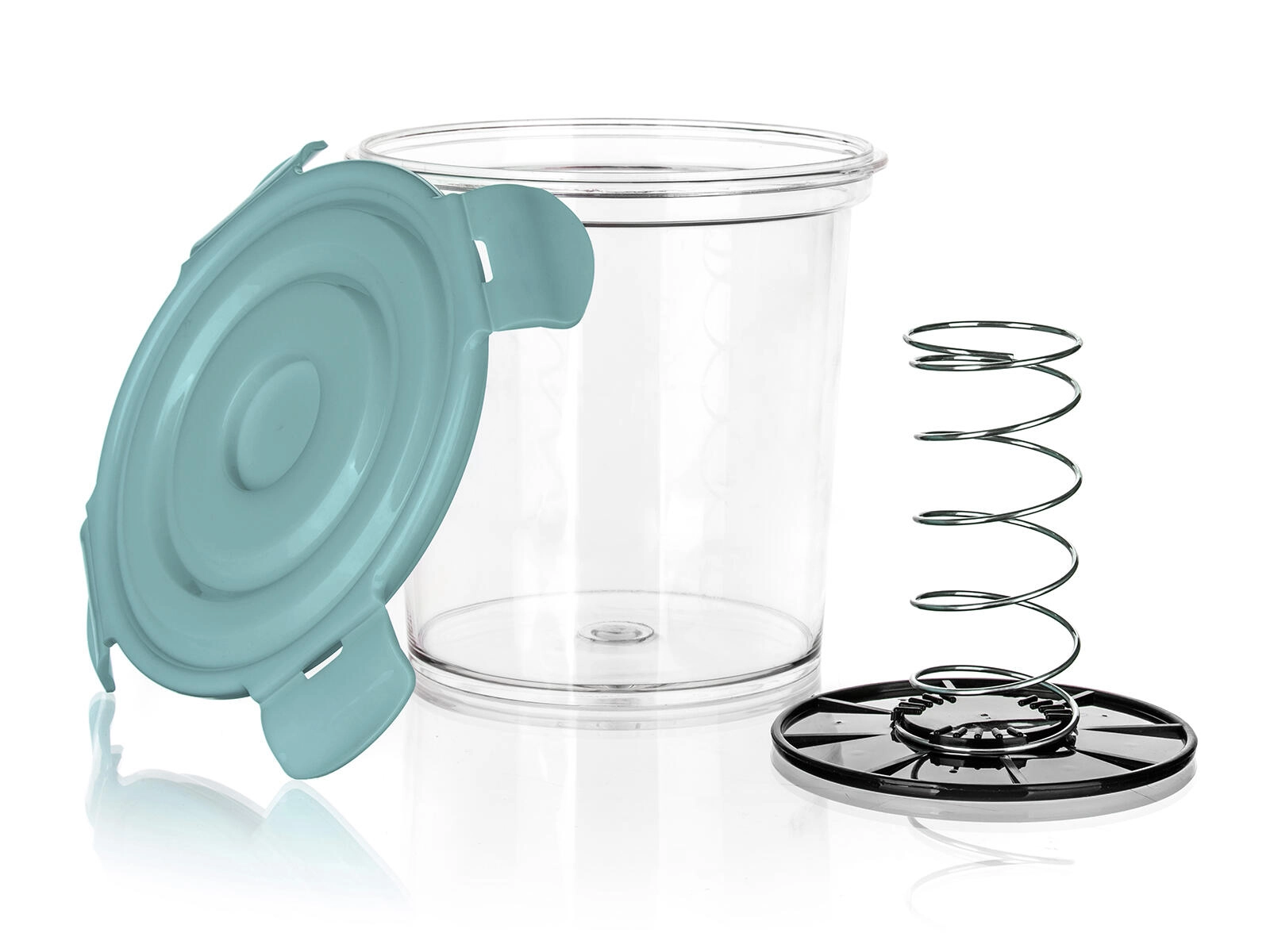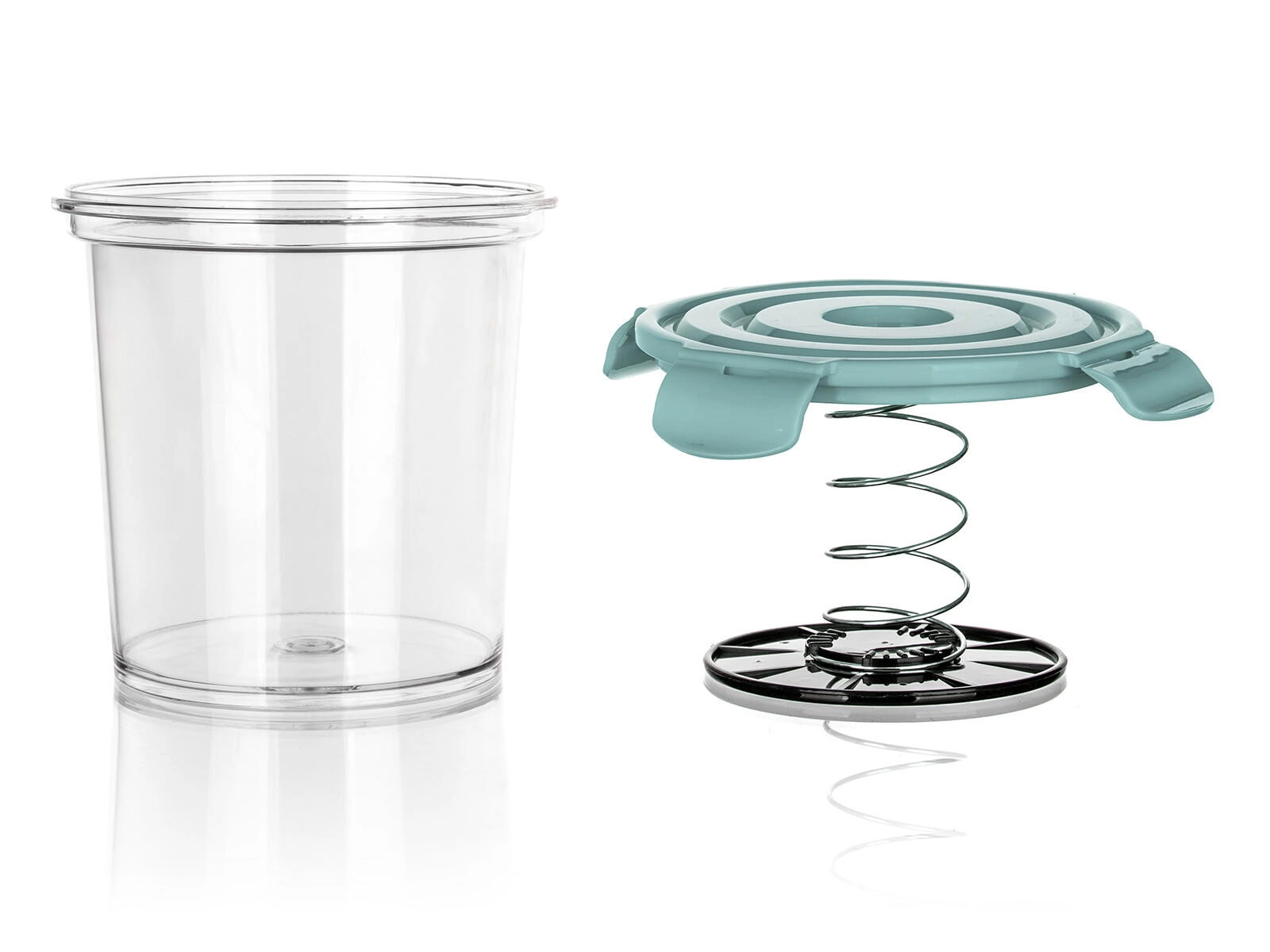 Un ressort intégré et un disque de pression maintiennent les aliments totalement immergés sous la surface de la saumure ou de l’huile, sans contact avec l’air – pour une saveur plus intense et une imprégnation homogène.