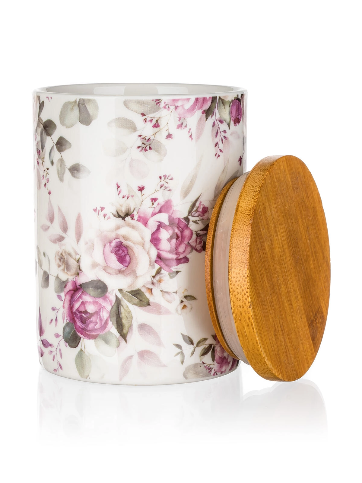 Élégant bocal en céramique avec couvercle en bambou et motif romantique de roses, idéal pour la conservation des aliments tels que café, thé, sucre ou herbes. Grâce à son joint en silicone, le contenu reste frais plus longtemps et votre cuisine gagne un accessoire décoratif et stylé.