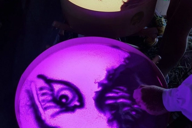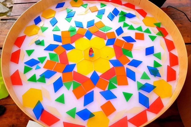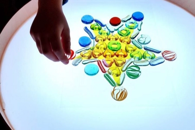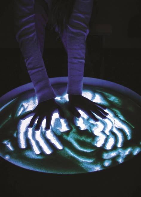 Sur le plateau, on peut dessiner avec les doigts, des pinceaux ou des outils en plastique, travailler avec du sable, des cailloux et d’autres matériaux sans crainte du désordre grâce au rebord surélevé. La table sert aussi de scène lumineuse pour un petit théâtre, d’éclairage décoratif pour la chambre d’enfant ou d’outil thérapeutique pour développer la perception des couleurs, des formes et des motifs.