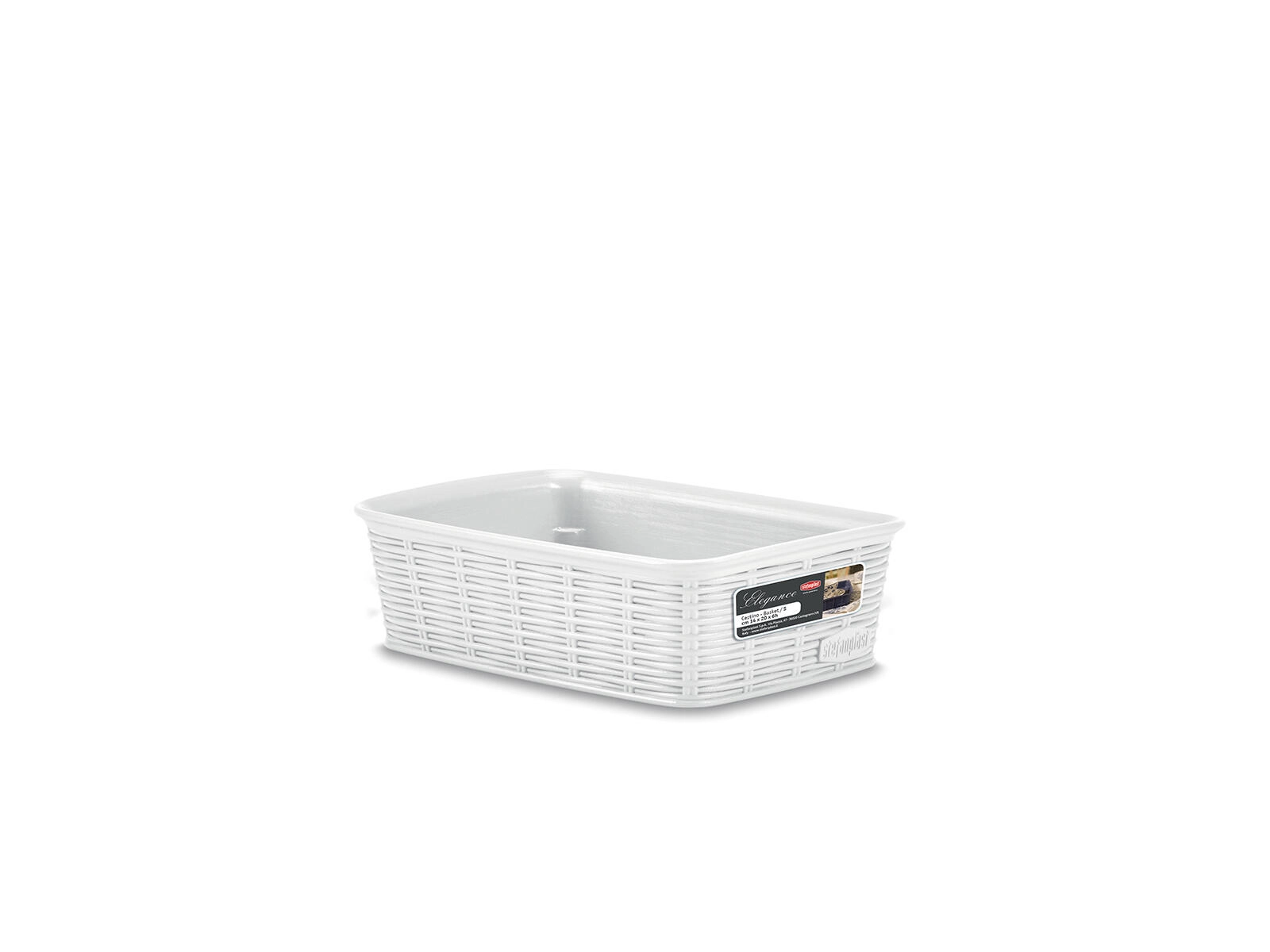 Pratique panier de rangement Elegance aux dimensions 20 × 14 × 6 cm en plastique résistant de couleur blanche. Idéal pour organiser les petits objets, conserver la boulangerie/pâtisserie et stocker les aliments dans la cuisine, la salle de bain ou le bureau. Léger, facile à nettoyer et accessoire universel pour la maison.