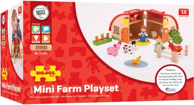 La valisette contient 15 pièces de jeu, dont un fermier, une fermière, des animaux et d’autres indispensables de la vie à la ferme.