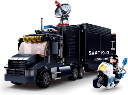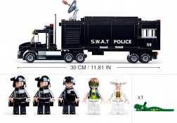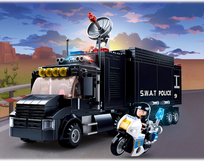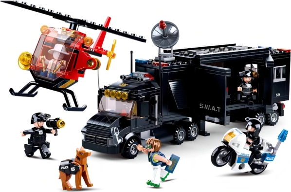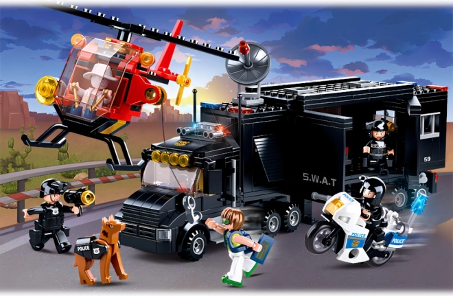 La pièce maîtresse du set est un camion SWAT noir – une base mobile aux détails réalistes qui sert de quartier général pour toutes les opérations de police. Idéal pour les déplacements tactiques et la planification des interventions.