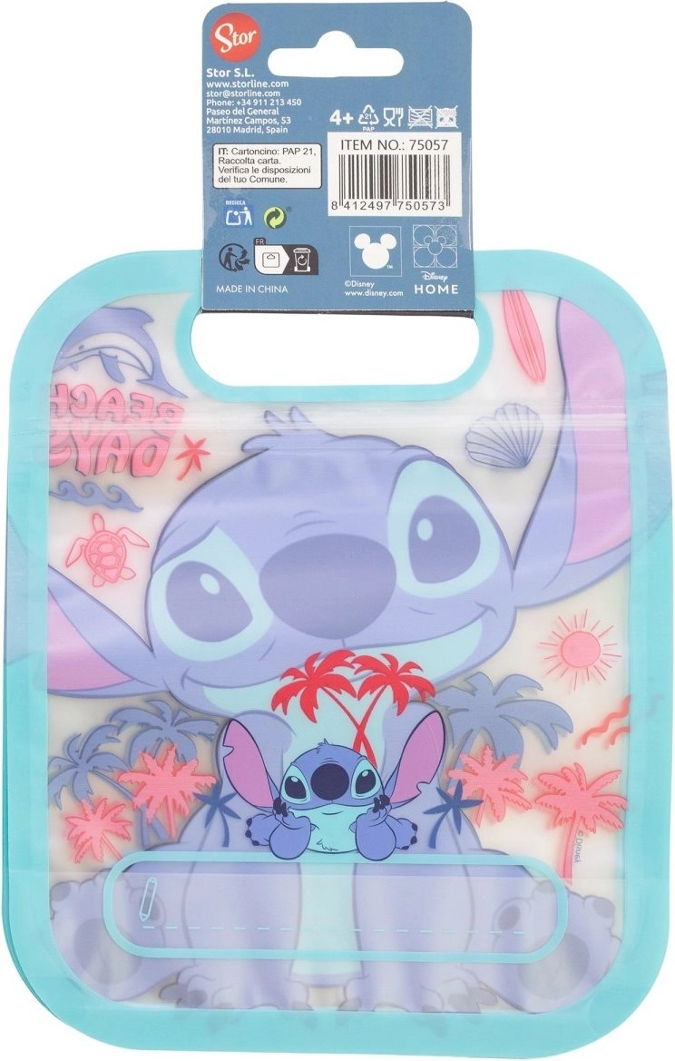 Gardez vos affaires organisées avec style grâce au set de 4 sachets réutilisables DISNEY Stitch. Grâce à leur fermeture zip fiable, vos encas, cosmétiques ou petits objets restent toujours bien protégés, à la maison, à l’école comme en voyage. Le motif joyeux de Stitch apporte une touche ludique à chaque journée.