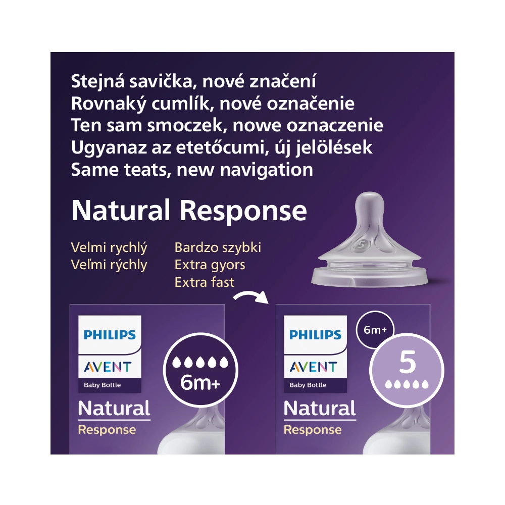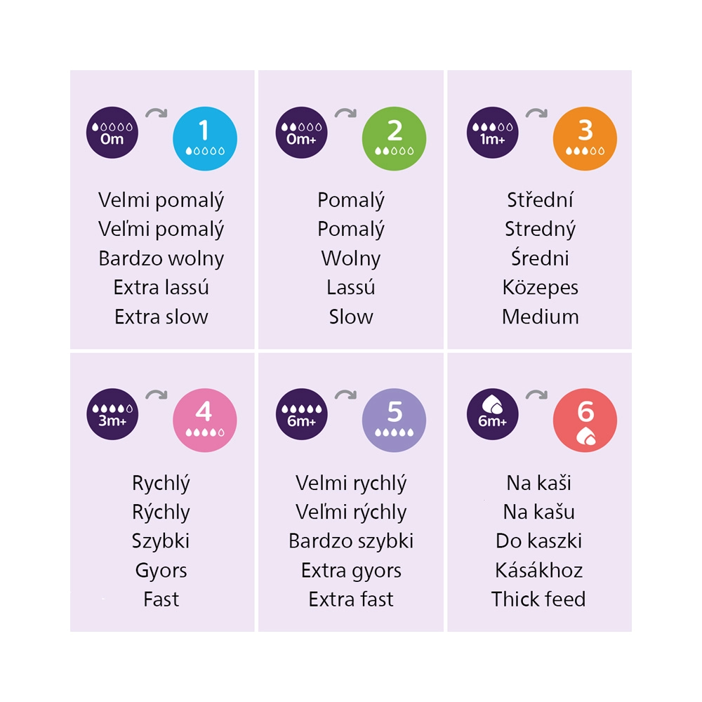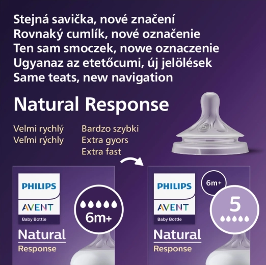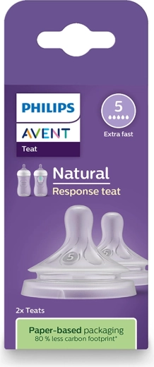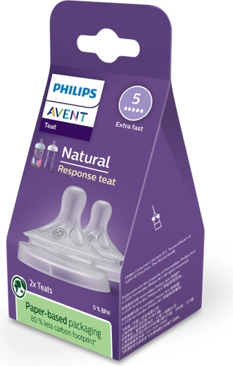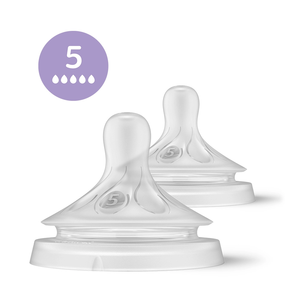 La tétine large et flexible en silicone souple imite la forme du sein, et l’indication « 5 » correspond à un débit extra rapide adapté aux enfants plus grands et plus affamés.