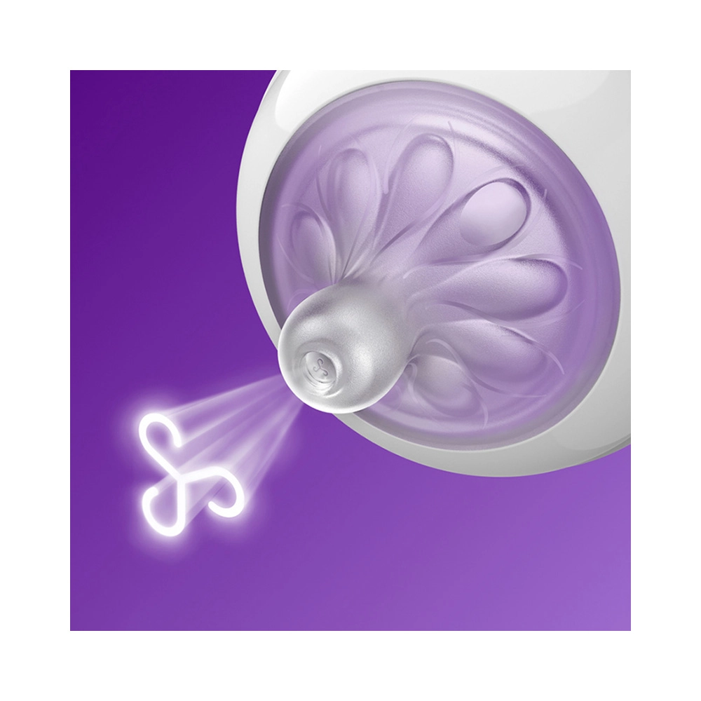 La tétine large, souple et flexible en forme de sein facilite la prise et une alimentation confortable. La valve anti-coliques intégrée aide à limiter l’entrée d’air dans le ventre et réduit le risque de gaz et d’inconfort. La conception de la tétine évite également les fuites, minimisant les déversements involontaires à la maison comme en déplacement.