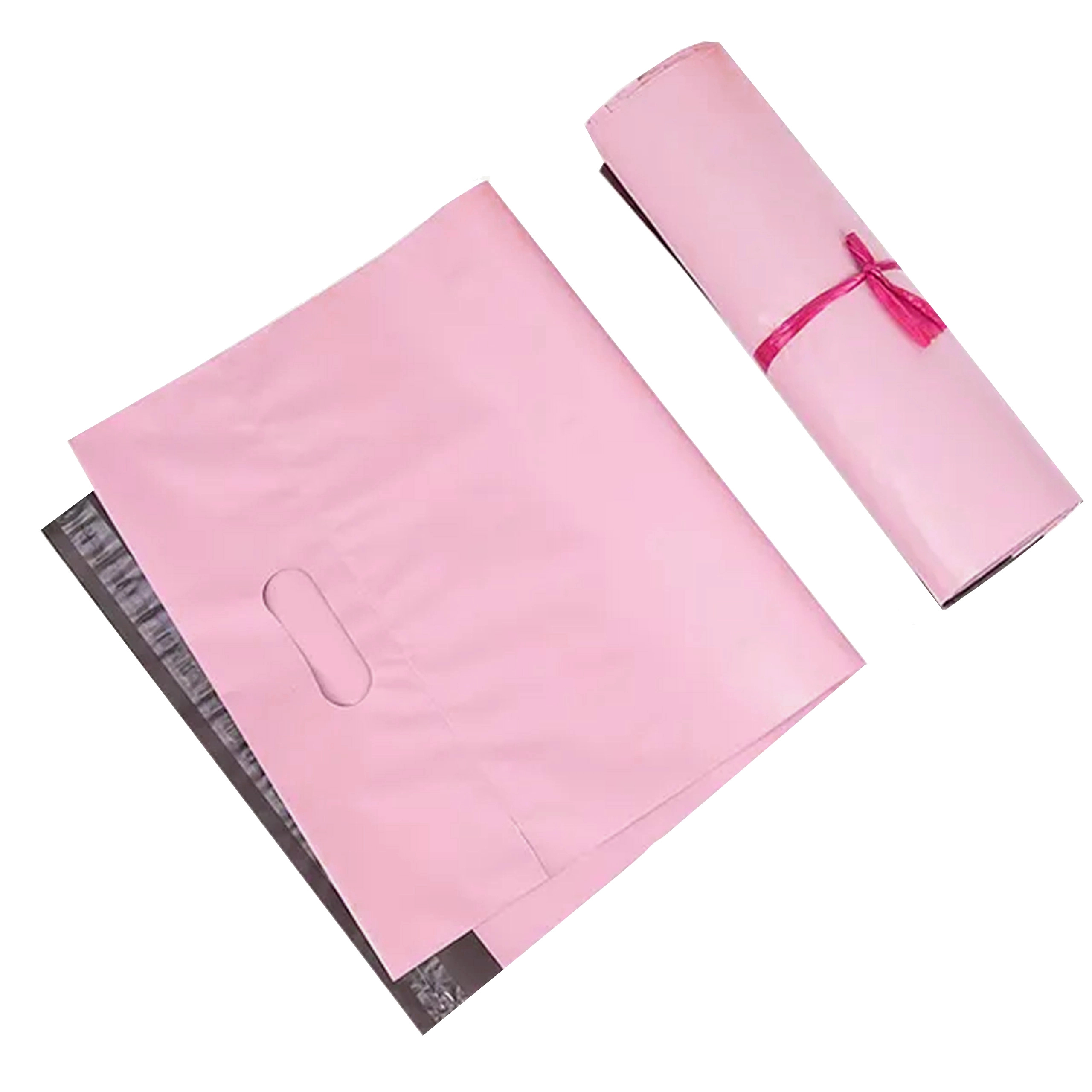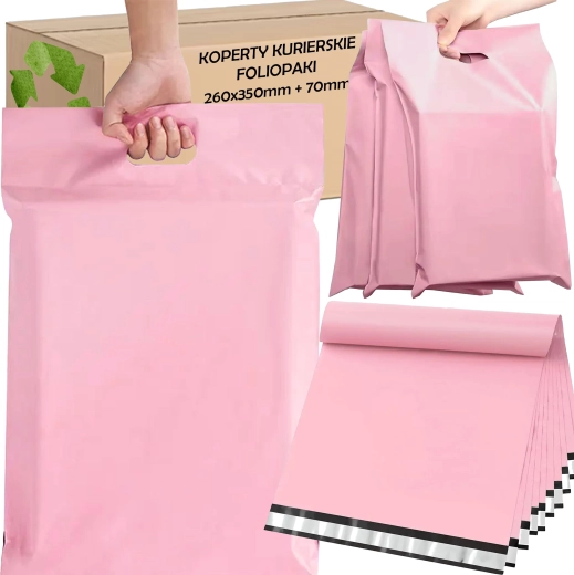 Enveloppes plastiques roses pour coursier avec poignée découpée 260 × 350 + 70 mm, paquet de 50