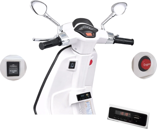 Le scooter électrique pour enfants au style VESPA allie design élégant et fonctions modernes. Il démarre par simple pression sur un bouton et la simulation du bruit du moteur crée une expérience de conduite authentique. La motorisation 2 × 12 V / 25 W et la batterie 12 V / 4,5 Ah assurent une conduite confortable et fluide, tandis que le phare avant apporte style et meilleure visibilité.