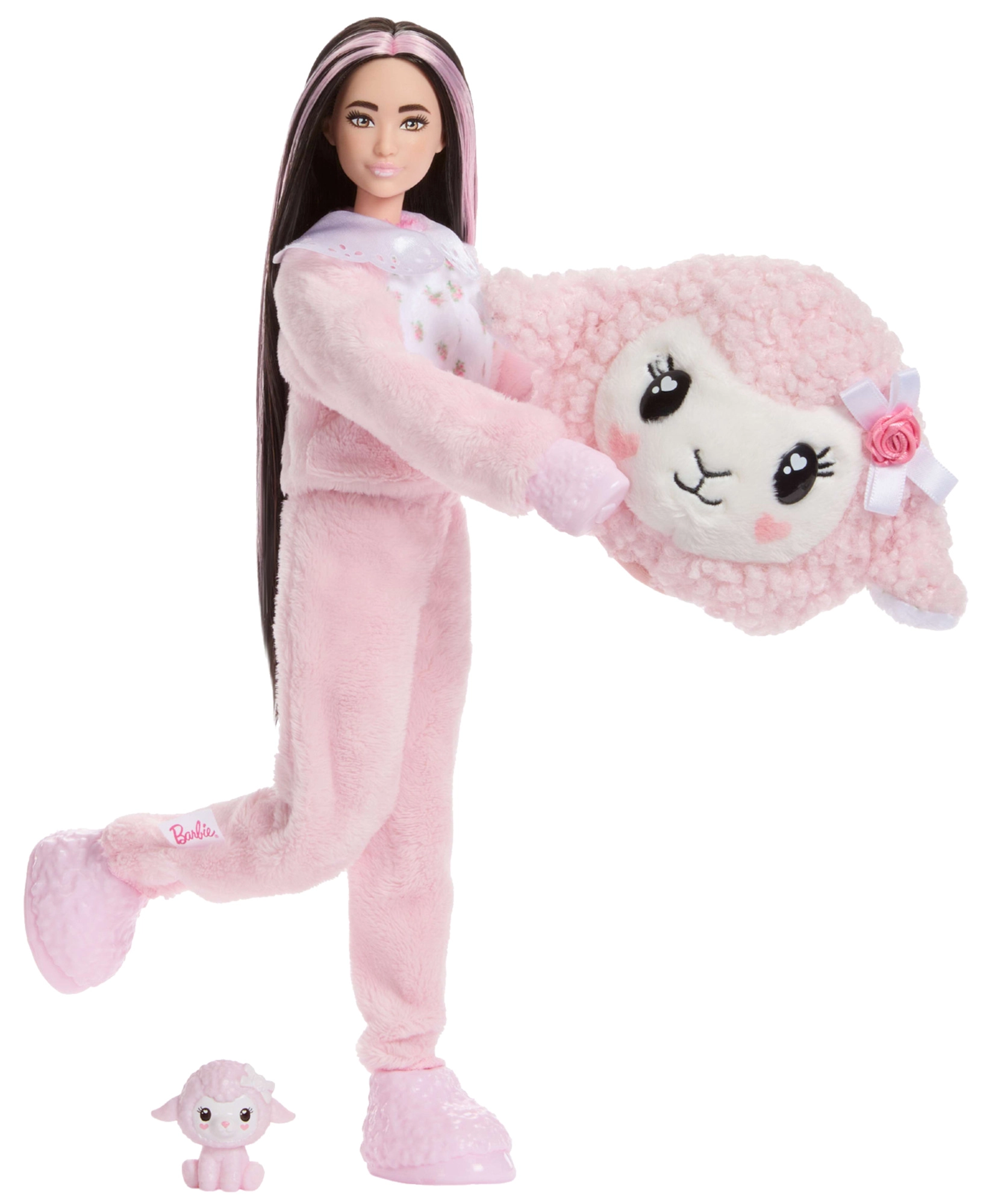 Entrez dans un monde de surprises et de style craquant. La poupée est cachée dans un doux costume de mouton rose au motif nœuds. Une fois révélé, découvrez une poupée BARBIE aux longs cheveux, prête à être coiffée et habillée. La tenue peut être retournée pour devenir une veste à la mode, et la tête du costume sert de petit lit pour le mini animal.