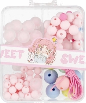 Mélange de perles rondes et translucides dans des tons doux, complété par une ficelle rose – idéal pour fabriquer bracelets et colliers.