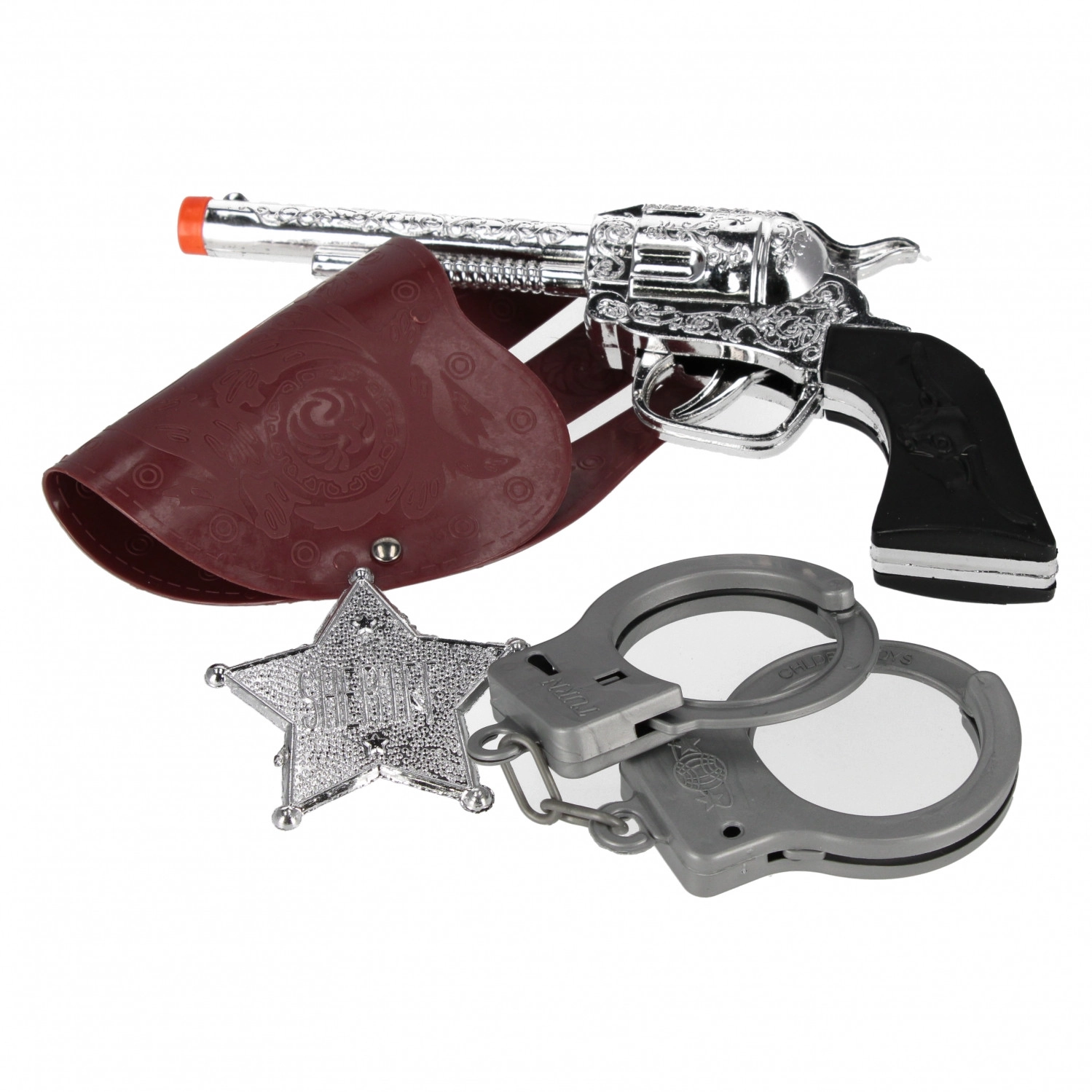 - Set complet : pistolet jouet, badge de shérif et menottes