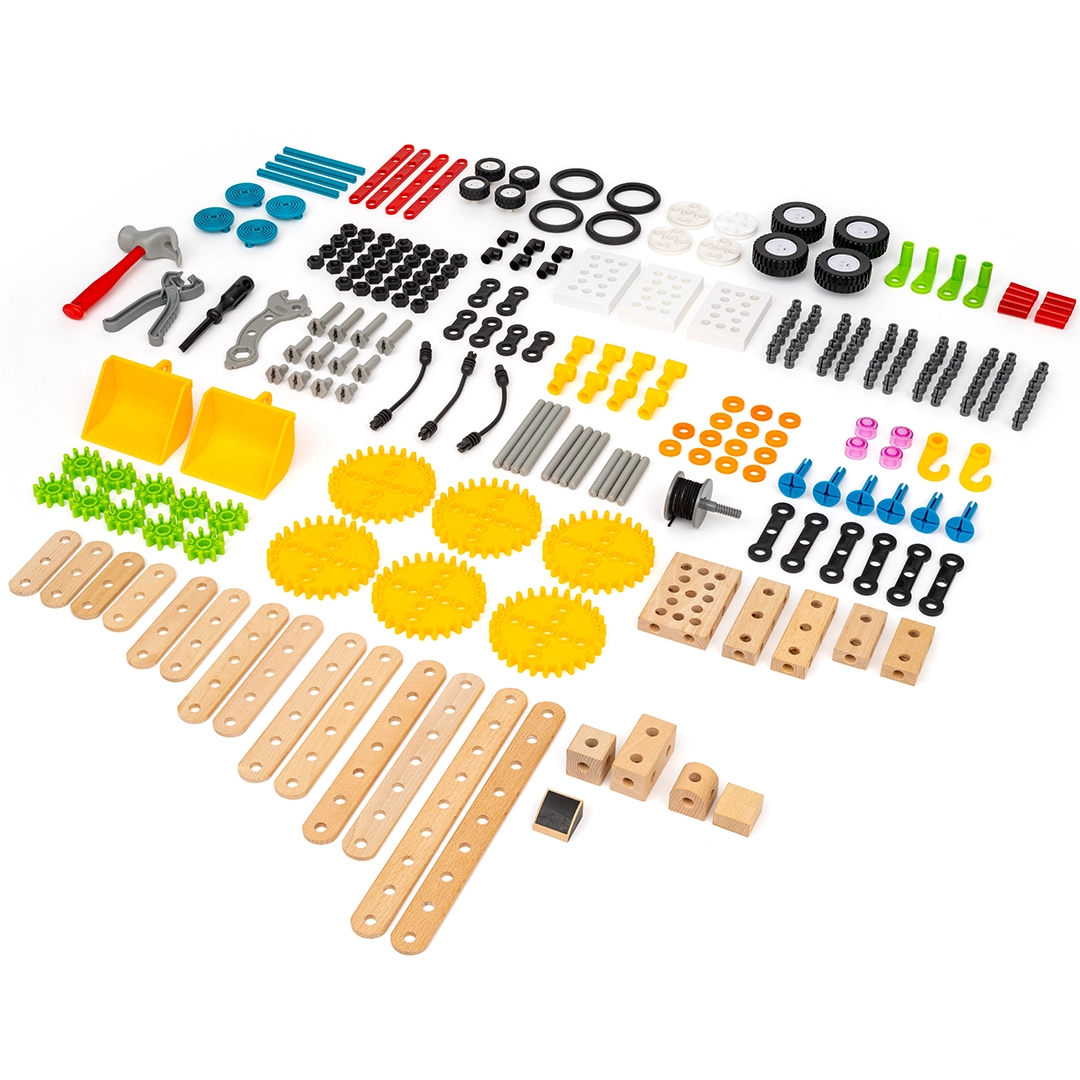 Les engrenages, axes et transmissions permettent aux enfants d’assembler des mécanismes fonctionnels – des roues qui tournent jusqu’aux systèmes d’engrenage simples qui animent leurs créations.
