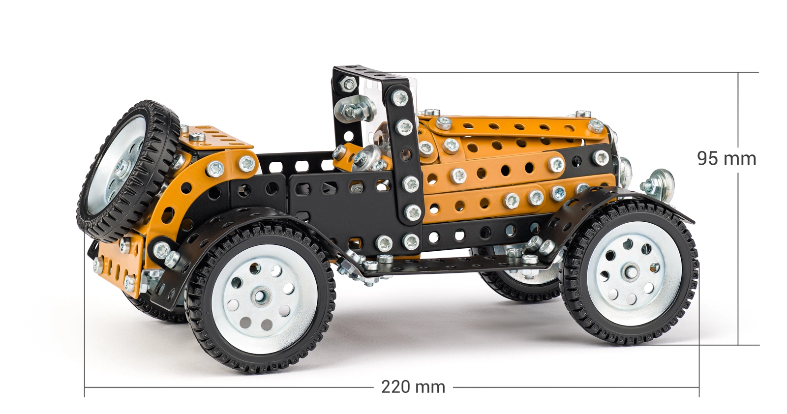 Ce que vous construirez : un modèle détaillé de voiture ancienne aux dimensions 9,5 × 9,5 × 22 cm, que vous pouvez exposer ou modifier selon votre imagination. L’emballage compact (18 × 26 × 5 cm) est idéal comme cadeau.