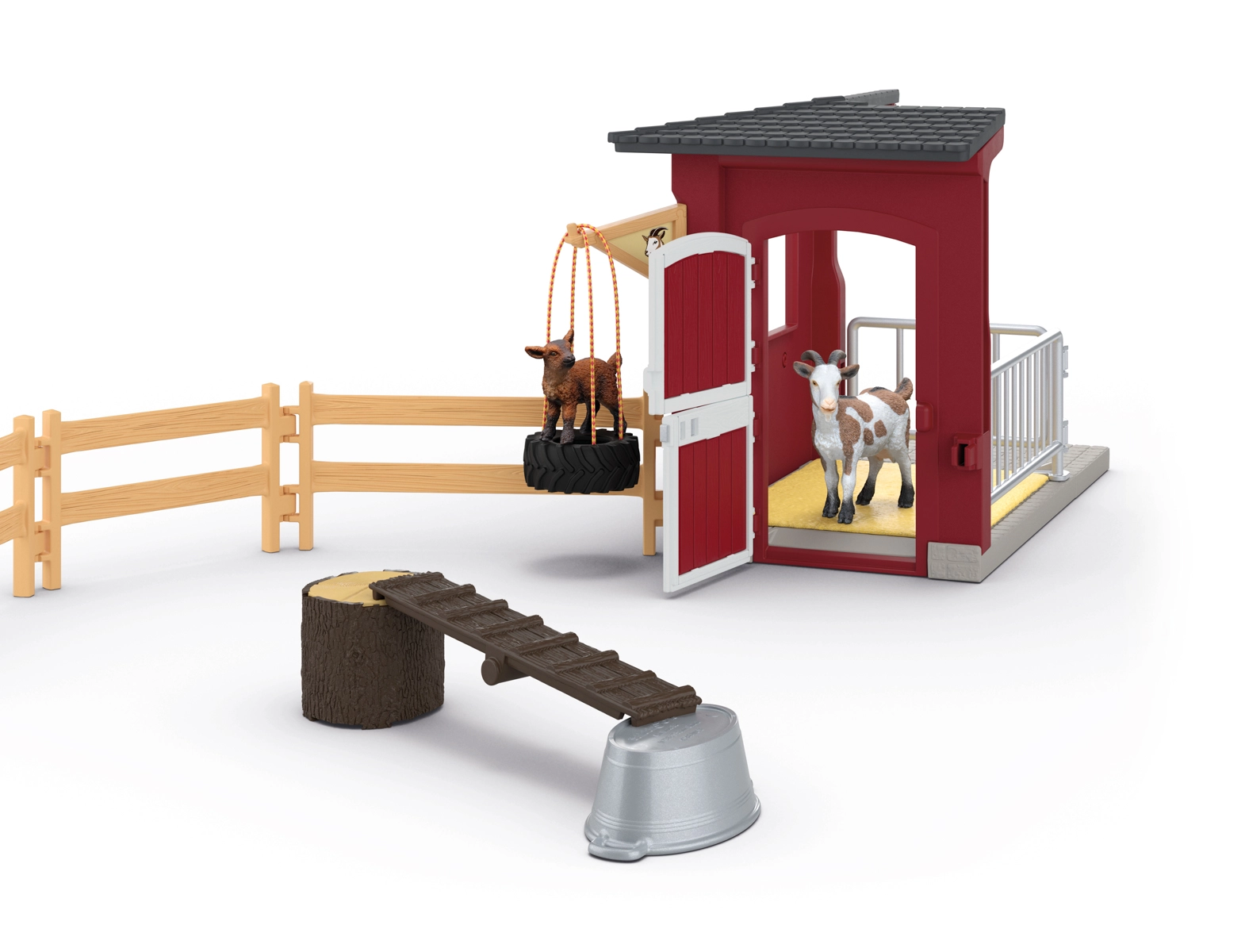 Le chevreau peut grimper sur la rampe et se balancer sur le pneu – parfait pour un jeu actif et créatif.