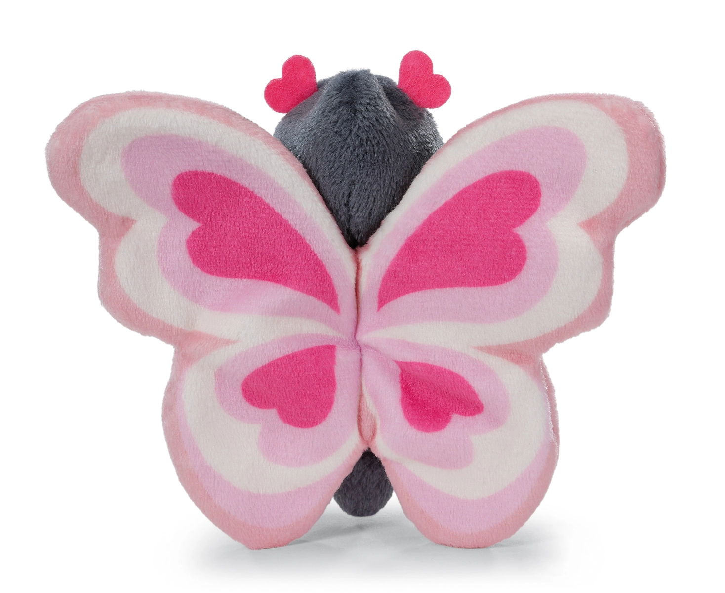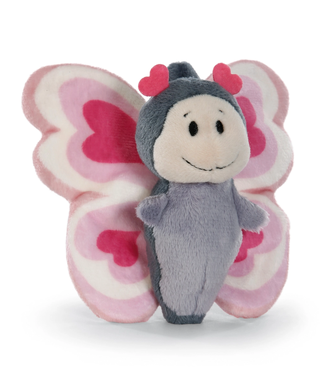 Un corps tout doux dans des tons gris et des ailes roses ornées de cœurs garantissent que vous tomberez amoureux du papillon au premier regard comme au premier toucher.