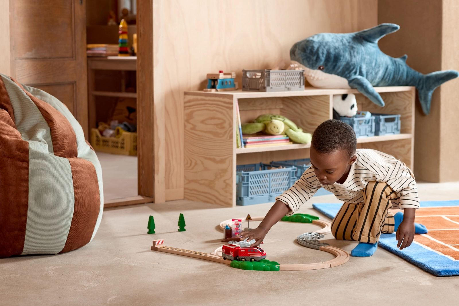 Rails courbes et droits, pont, quai, signalisation et arbres permettent aux enfants de créer des circuits variés et de développer leur imagination.