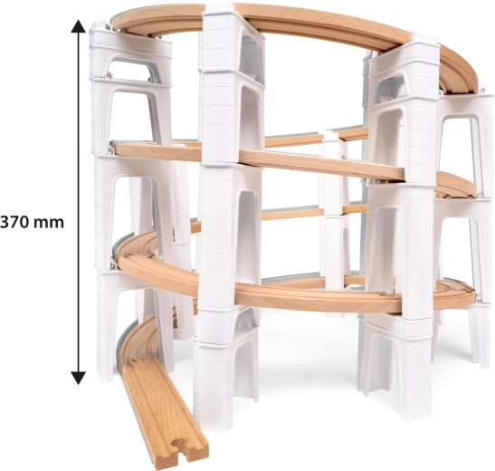 La méga-spirale BRIO World fait passer le classique chemin de fer en bois à un nouveau niveau. Grâce à 32 supports modulaires et 30 rails en bois, créez facilement une impressionnante voie en hauteur avec descentes rapides, montées dynamiques et passages de ponts stables. Le long pont rouge apporte un look emblématique et une circulation fluide.