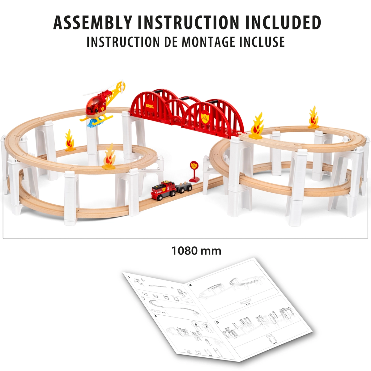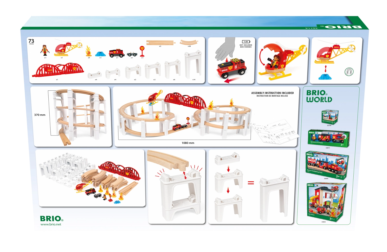 - 73 (32× supports modulaires, 30× rails en bois, 1× long pont rouge, 1× locomotive à batterie, 1× wagon de fret, 1× cargaison d’eau, 1× hélicoptère, 1× figurine de pompier, 4× accessoires de pompiers, 1× panneau de pompier)