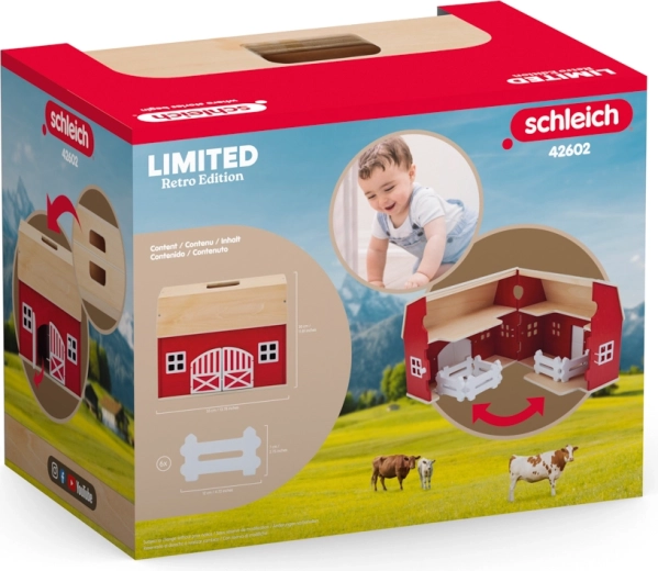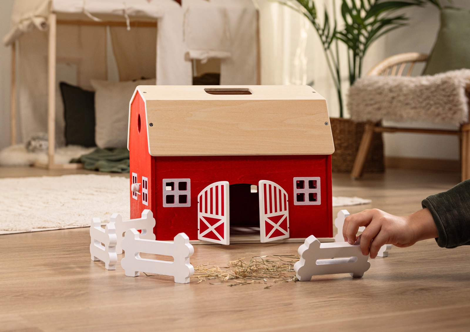 Grâce à sa poignée intégrée, la ferme est idéale pour les déplacements. Des détails bien pensés, comme les grandes portes et le toit haut, stimulent l’imagination et le développement de la motricité fine. Le complément parfait pour les figurines et accessoires SCHLEICH – il suffit de préparer l’enclos et les animaux peuvent emménager !