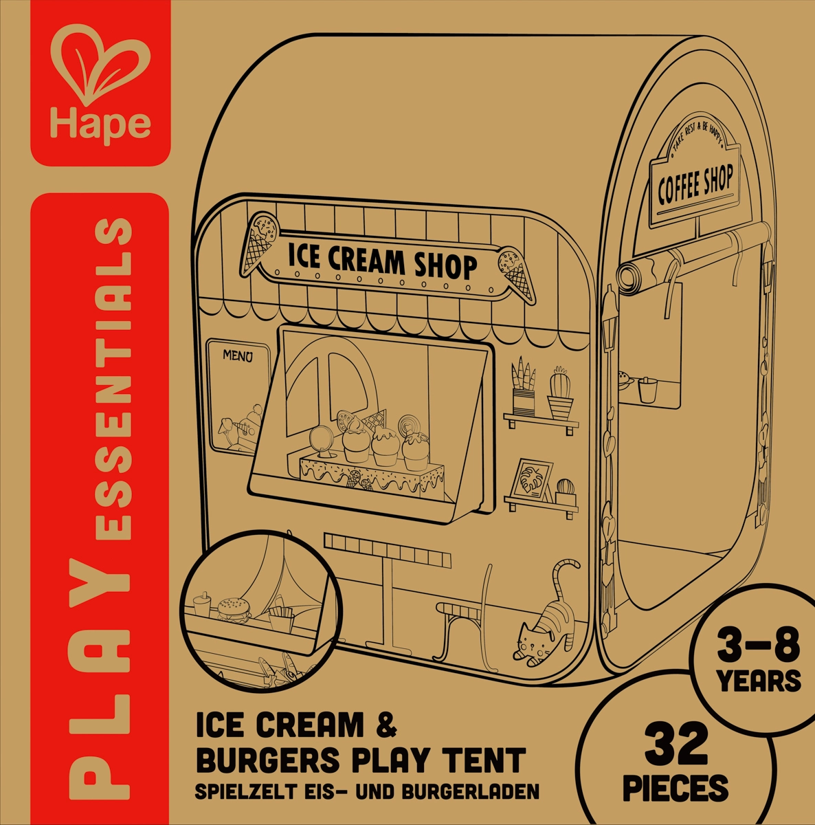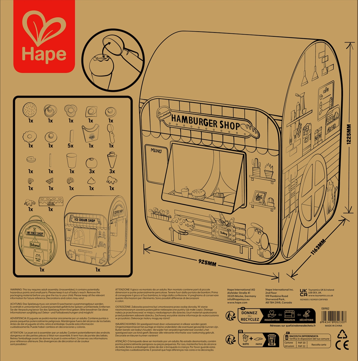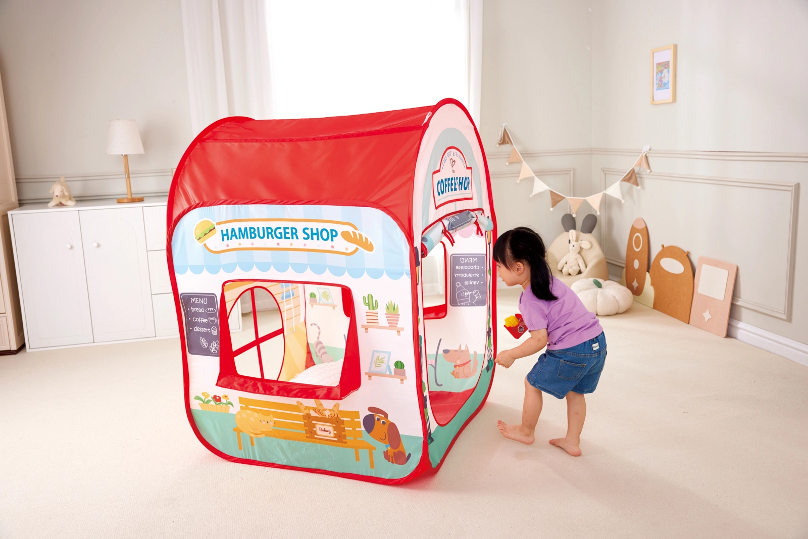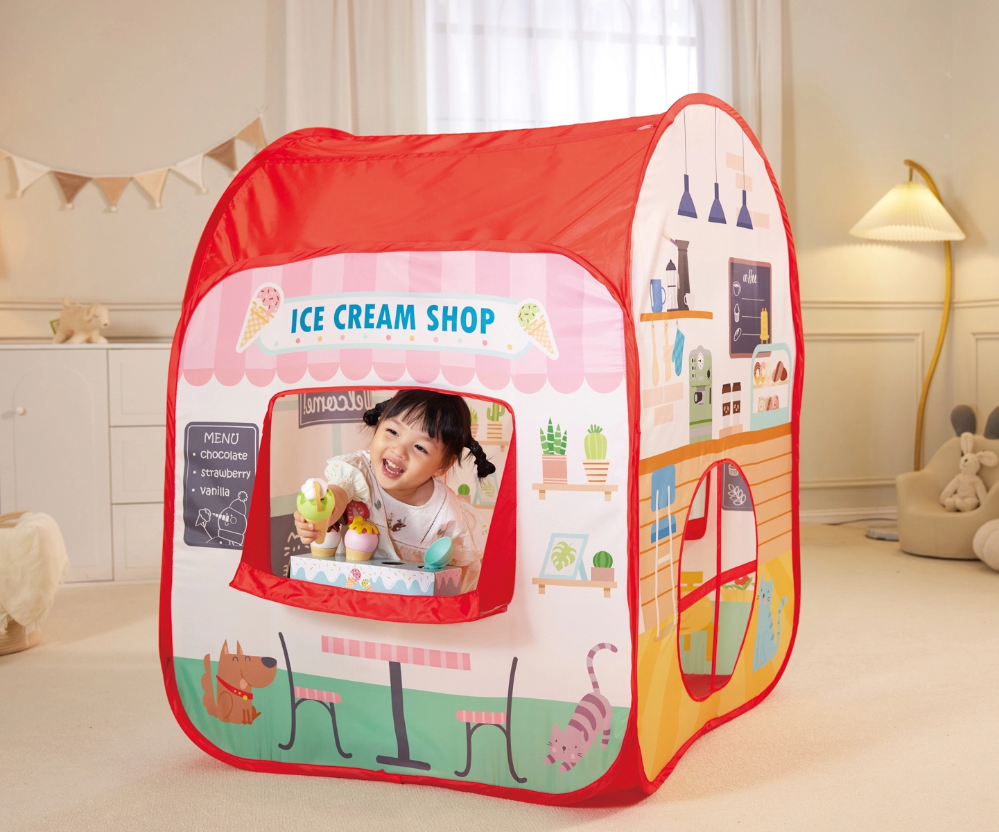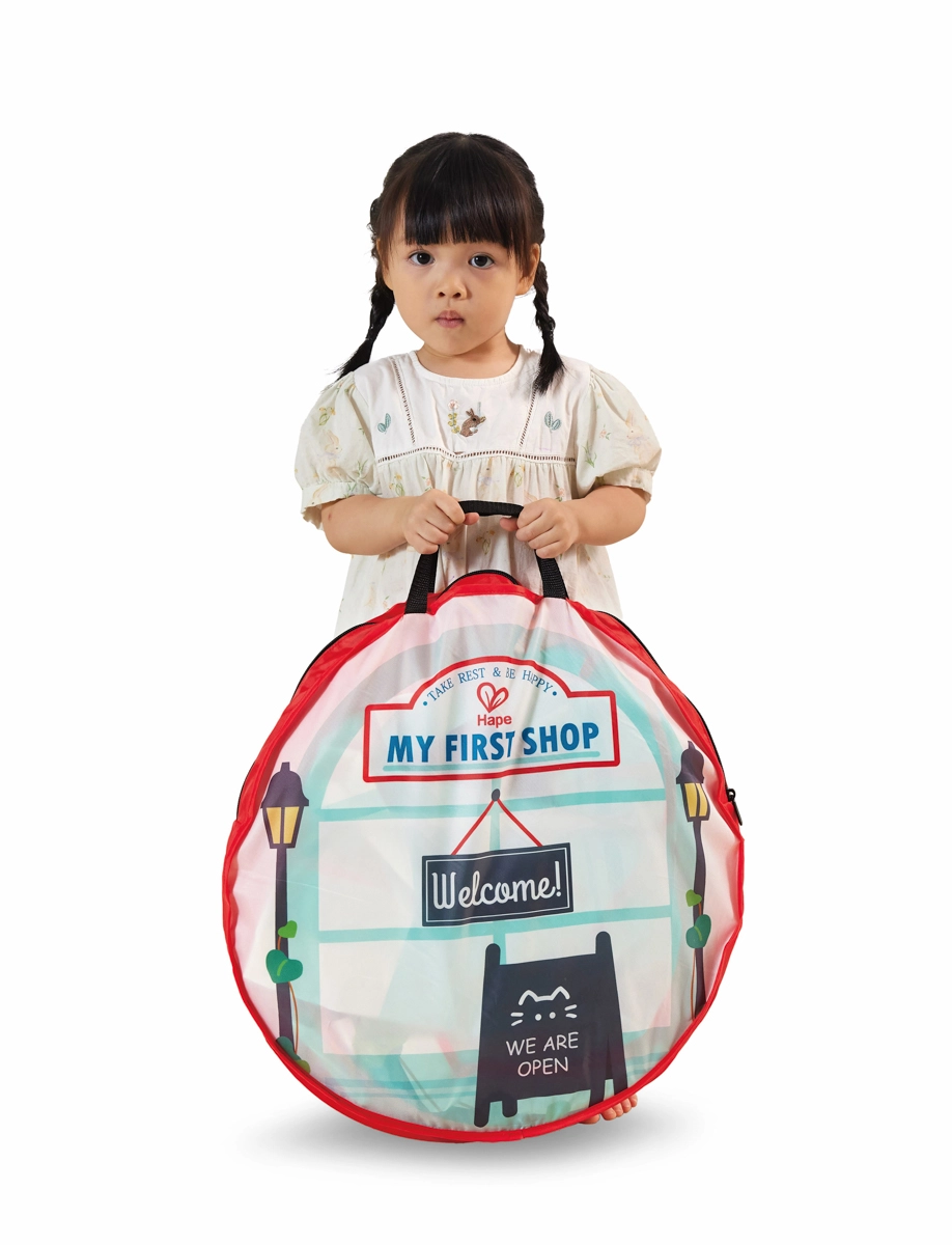 Transformez la chambre en une rue animée pleine de saveurs ! Cette élégante tente-boutique « My First Shop » combine glacier, burger shop et café en un seul lieu. Grâce à ses imprimés réalistes, sa fenêtre de service et ses portes d’entrée, les enfants profitent d’un service client authentique et de scénarios de jeu variés.