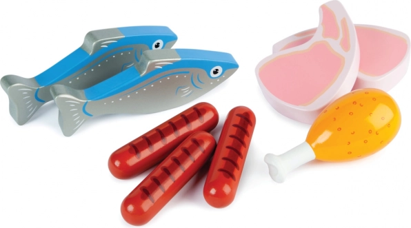Livraison fraîche de viande et de poissons dans une boîte en bois avec poignées. Excellent jouet pour jouer au marchand ou au cuisinier, l’ensemble comprend 2 poissons, 2 côtelettes, 3 saucisses et 1 pilon de poulet. Une excellente façon d’enseigner aux enfants l’importance d’une alimentation saine et équilibrée, ainsi que l’origine des aliments et leur préparation. Chaque pièce est dodue et idéale pour les petites mains d’enfants. Encourage le jeu créatif et imaginatif. Fabriqué avec des matériaux de qualité provenant de sources responsables. Conforme à la norme de sécurité européenne. Principales caractéristiques : forme idéale pour les petites mains d’enfants, stimule la créativité et l’imagination