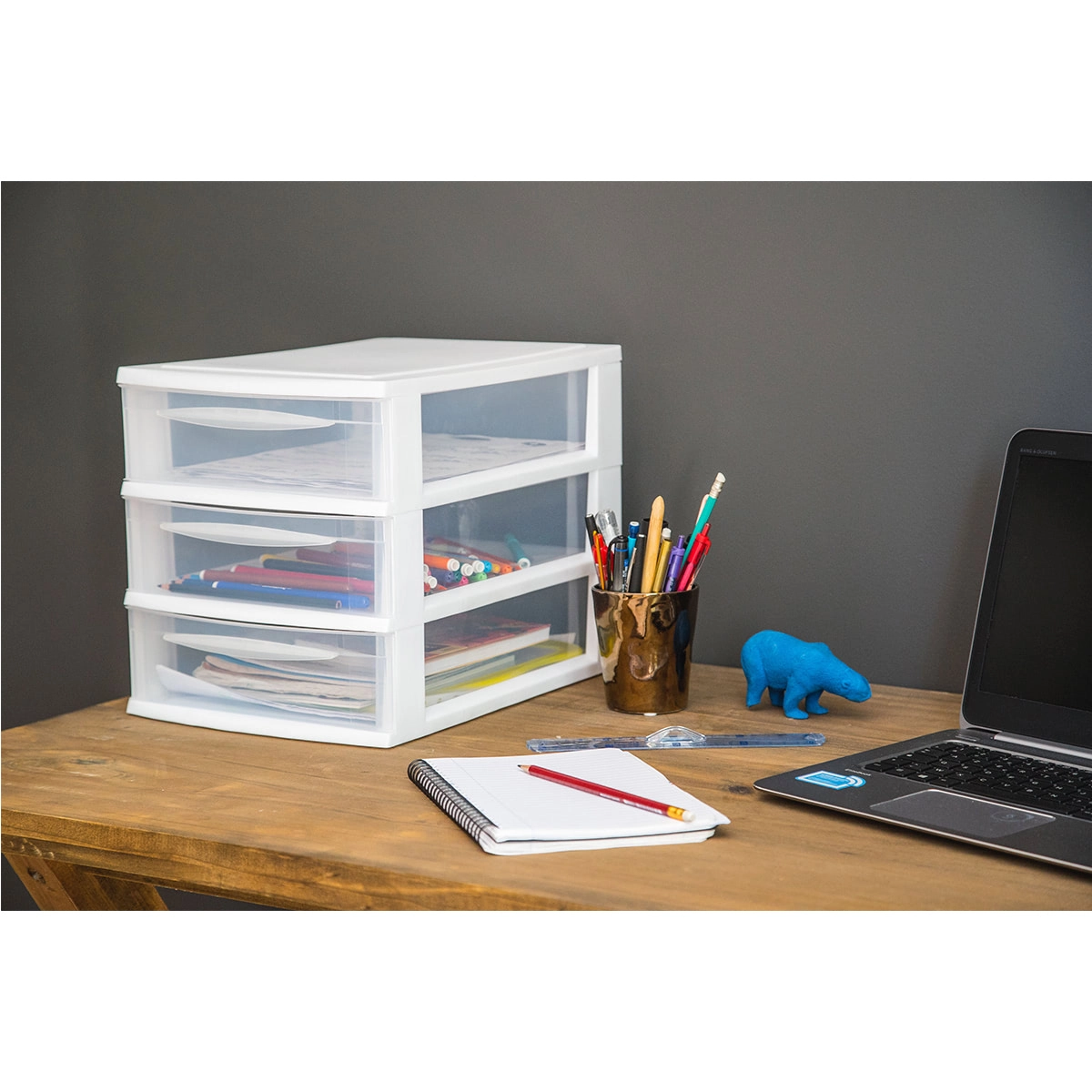 Trois tiroirs étroits gardent documents, notes et petites fournitures de bureau rangés avec soin et facilement accessibles, sur le bureau comme sur une étagère.