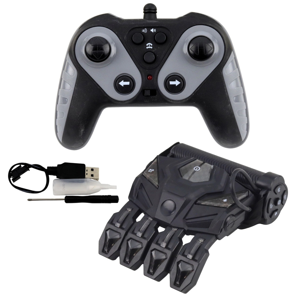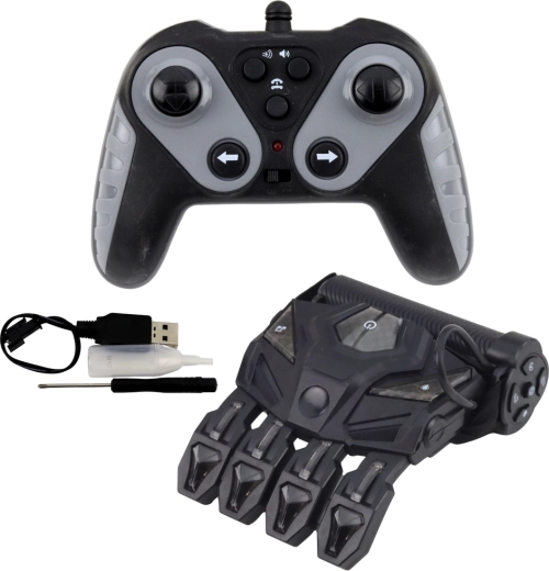 - Voiture RC, contrôleur gestuel (gant), télécommande, 2× batterie, chargeur