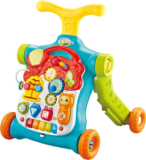 Le panneau comprend un petit piano avec des notes, des boutons lumineux et sonores, des éléments rotatifs, des formes à encastrer, des perles et des curseurs. Grâce à eux, les enfants entraînent la préhension, la logique, la concentration et l’imagination. Le verrouillage des roues et la structure robuste renforcent la sécurité, tandis que le plastique de qualité assure la durabilité.