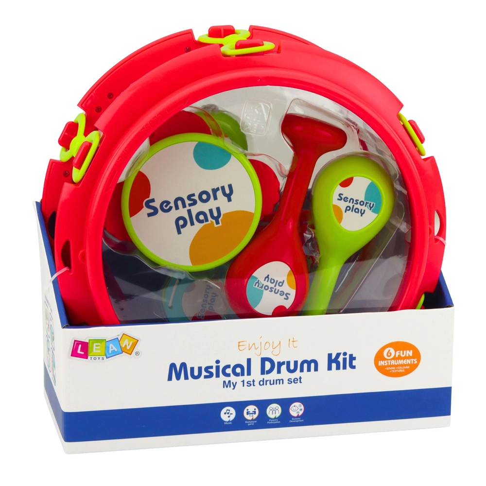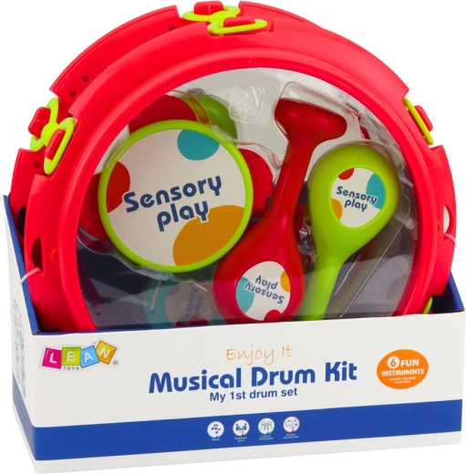 Un petit tambour léger aux couleurs vives avec deux baguettes développe le sens du rythme et la coordination. Il sert aussi de boîte de rangement pour les autres instruments.