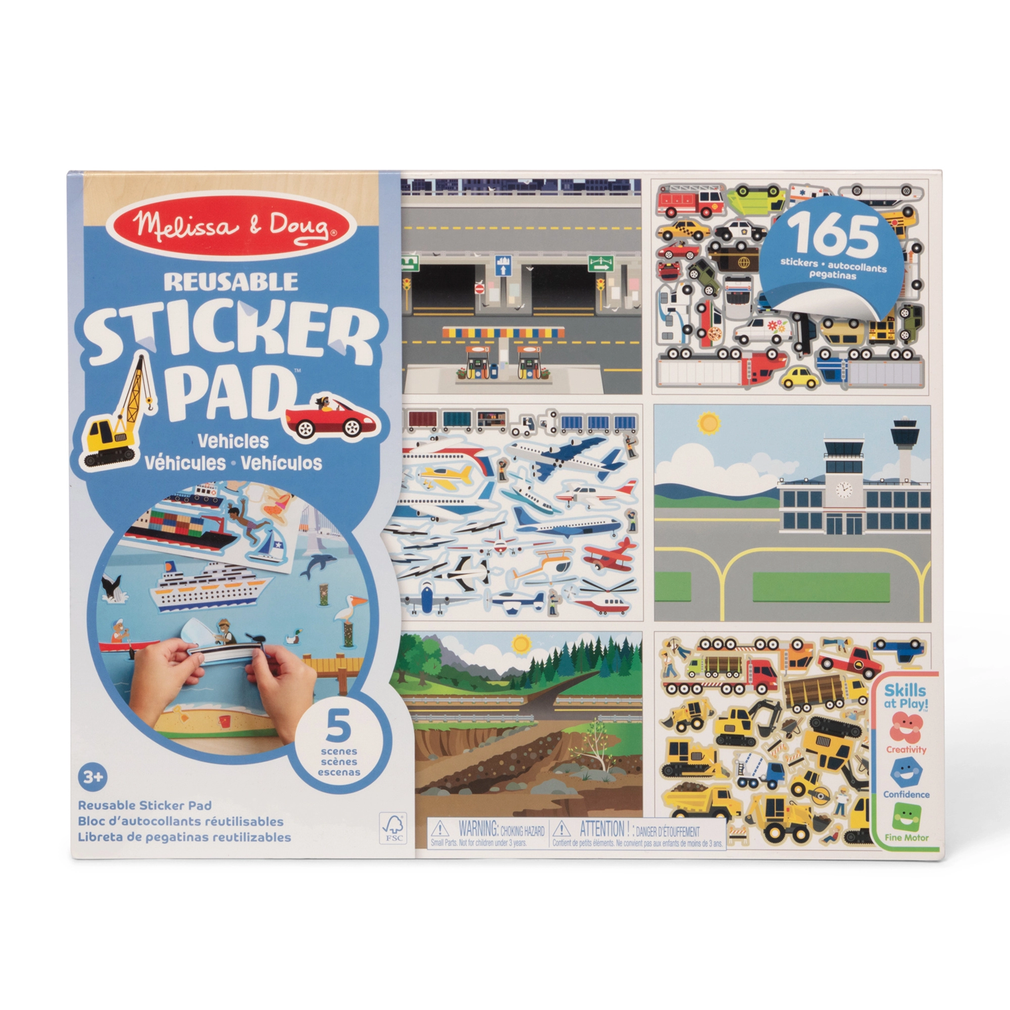 Cinq arrière-plans colorés — rue, aéroport, chantier, voies ferrées et baie — offrent des décors variés pour le jeu et la stimulation de l’imagination.
