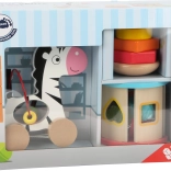 Le zèbre offre une présentation ludique sur roues avec possibilité de mouvement grâce à une ficelle. Grâce au circuit de perles, les enfants peuvent améliorer leurs compétences motrices.