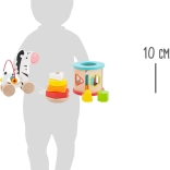 Ce set de jeu est conçu pour les tout-petits et propose des activités variées qui soutiennent le développement moteur. Chaque jouet du set est soigneusement fabriqué en bois et arbore un design coloré attrayant qui encourage les enfants à jouer :