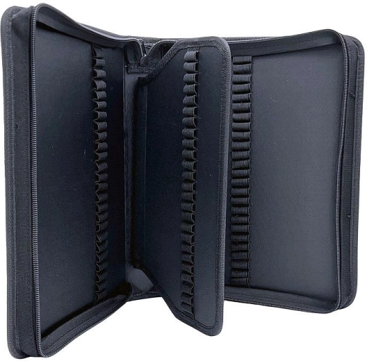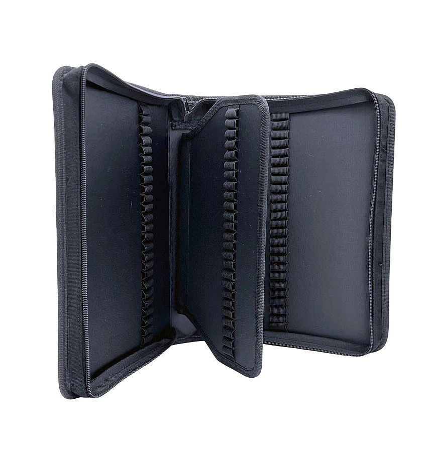 Le côté gauche contient 25 passants, la partie intérieure du rabat offre 2 × 25 passants (sur chaque face du rabat) et le côté droit ajoute encore 25 passants. La fermeture éclair fiable maintient le contenu en sécurité lors du transport et de la présentation.