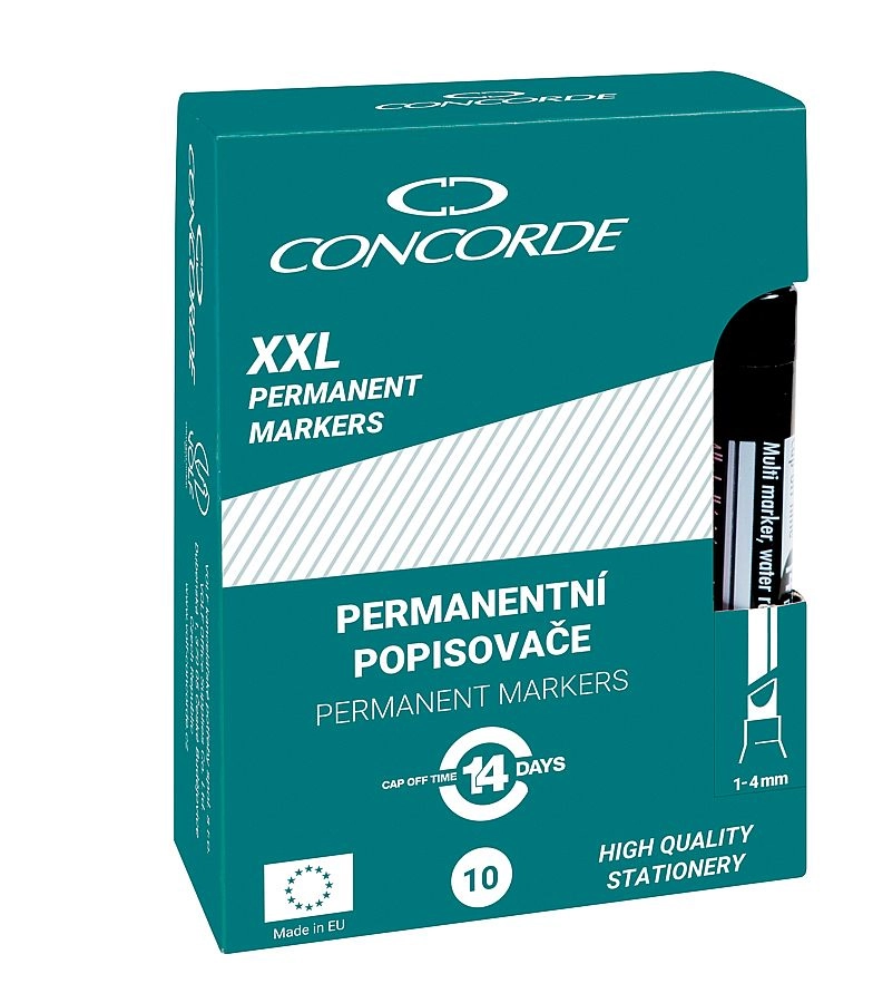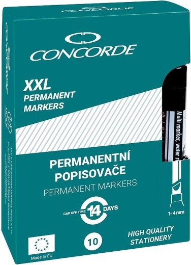 Marqueur permanent universel CONCORDE avec encre opaque à base d’alcool pour un marquage fiable sur films, verre, plastiques, bois et métal. Il offre une écriture indélébile et résistante à l’eau, une pointe ronde de 3 mm et une endurance exceptionnelle – jusqu’à 14 jours sans capuchon sans dessécher.