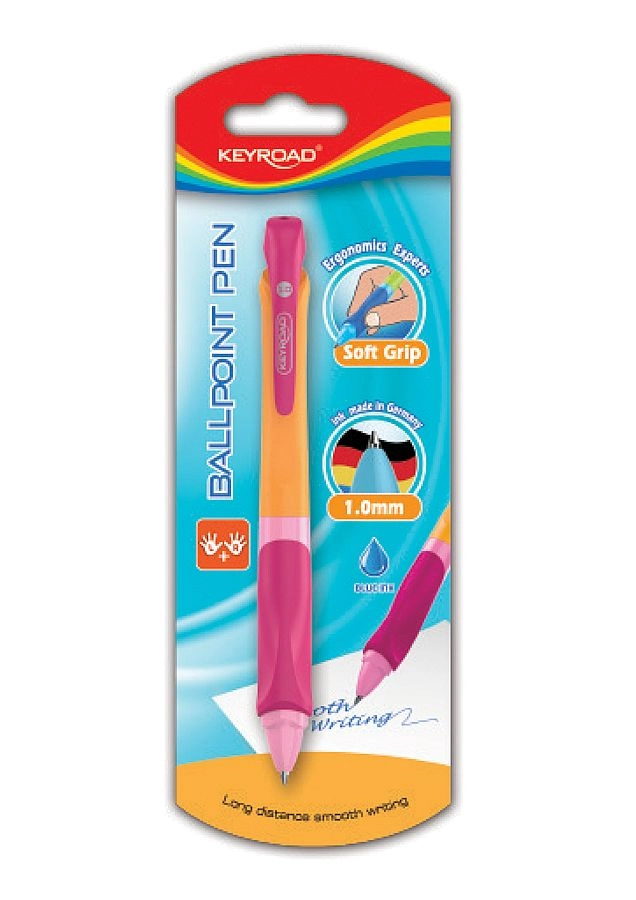 Élégant stylo bille KEYROAD Neo de couleur rose offrant une écriture fluide et régulière, une cartouche Silver haute capacité et une prise ergonomique souple. Avec une pointe de 1,0 mm, il est idéal pour les notes quotidiennes à l’école comme au bureau et convient aux droitiers comme aux gauchers. Livré en blister.