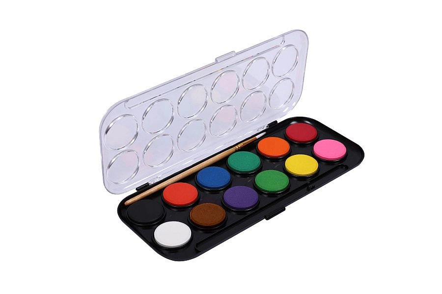 Pratique, le set scolaire d’aquarelles CONCORDE propose 12 teintes intenses dans un étui compact en plastique avec couvercle transparent. Chaque godet a un diamètre de 30 mm pour un prélèvement facile de la couleur, un pinceau est inclus et l’emballage est adapté à la suspension.