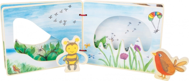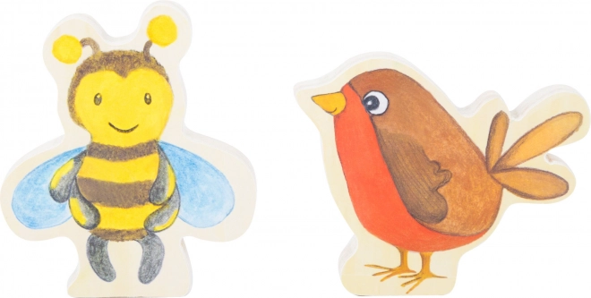 - Livre d’images en bois + 2 figurines en bois (abeille, oiseau)
